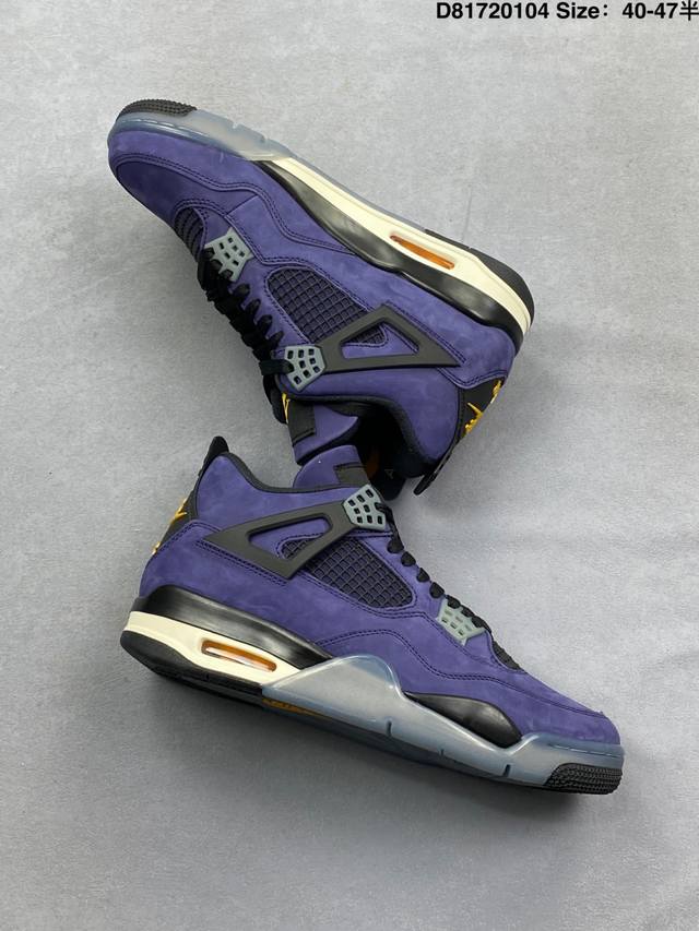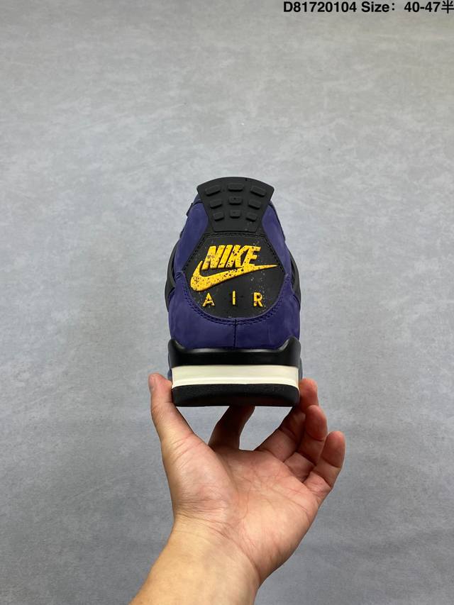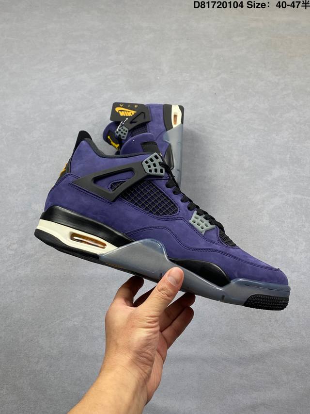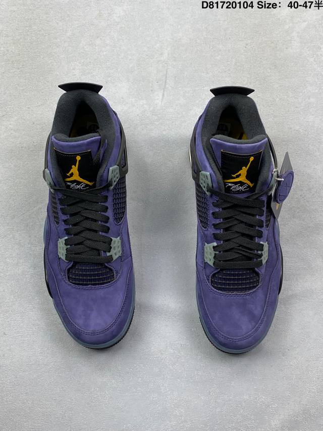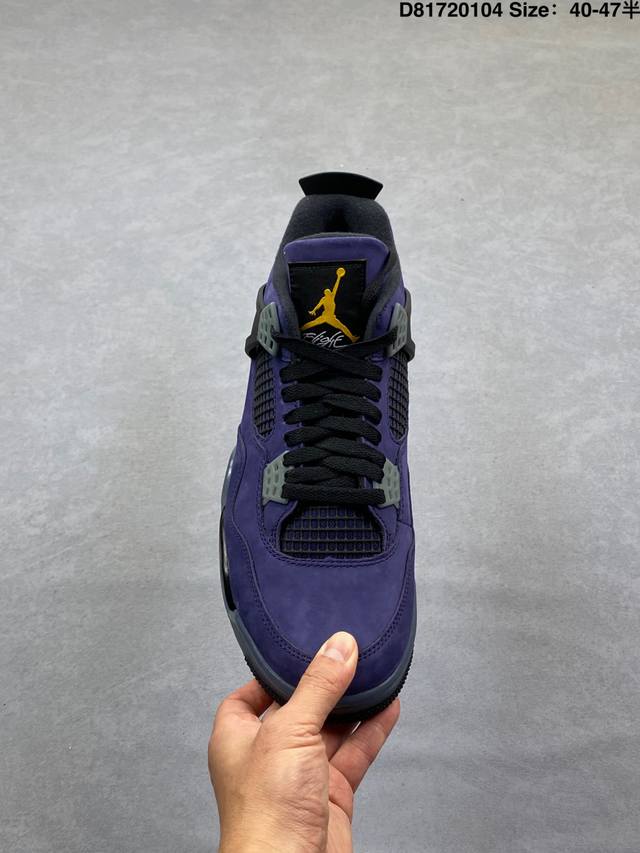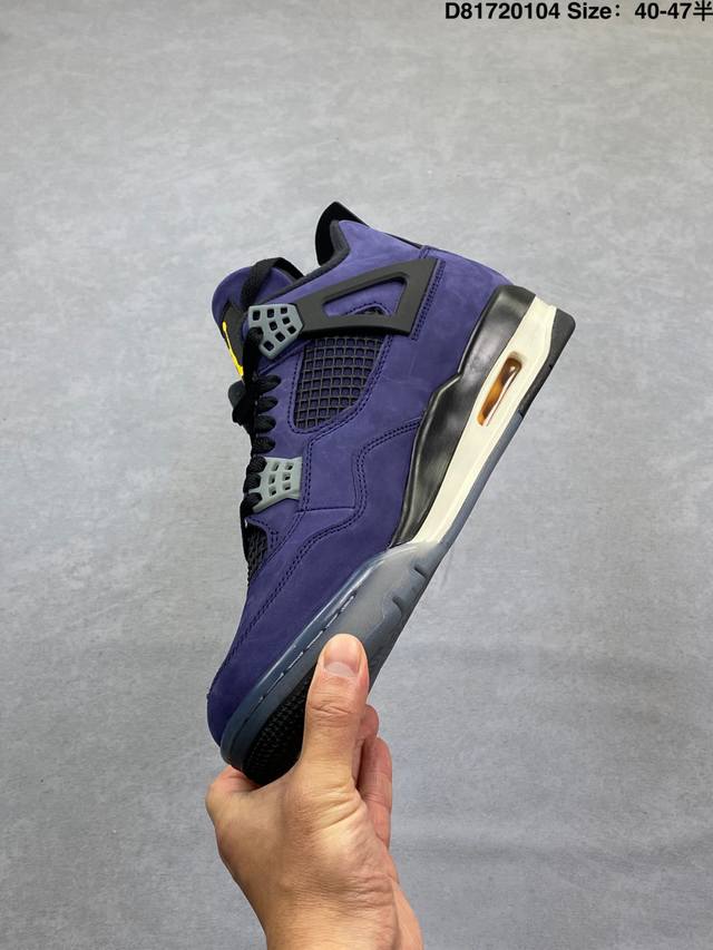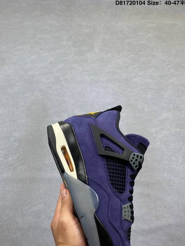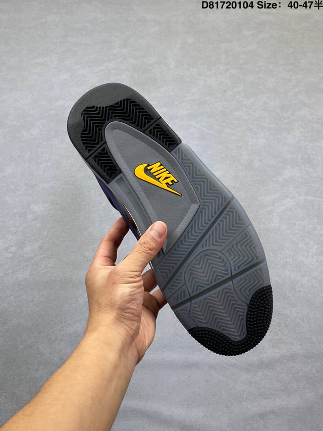 Pure Original Suede DDD Air Jordan 4 Retro Og Imperial Purple Retro AJ4, Jordan 4, Lakers Purple and Yellow Unisex Jordan Basketball Shoes Series. The shoe body is mainly purple leather, with gray details, presenting the classic Lakers color scheme. Black laces complete the look. The black mesh on the side reveals the purple inner layer, and the black tag at the top of the tongue features a bright yellow Jumpman logo and white Flightt embroidered lettering, highlighting the shoe's identity. The TPU decorations around the eyelets are gray, adding a touch of detail. The upper and heel pull tabs are made of black TPU, adding more color depth to the shoe. The Nike Swoosh logo and embossed "Air" lettering on the heel are accented in bright yellow, while the mini Swoosh logo on the outsole is black. The midsole is also black, featuring a semi-transparent design, and the shoe is finished with a midsole equipped with a visible Air Solek unit. Style Code: Fv5029-500 Release Date: February 14, 2026 Size: 40