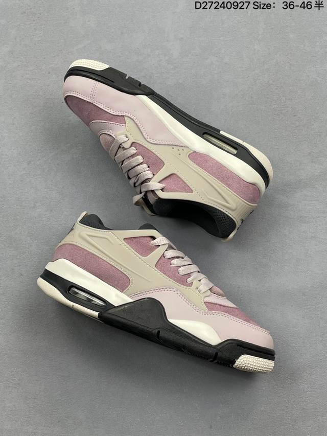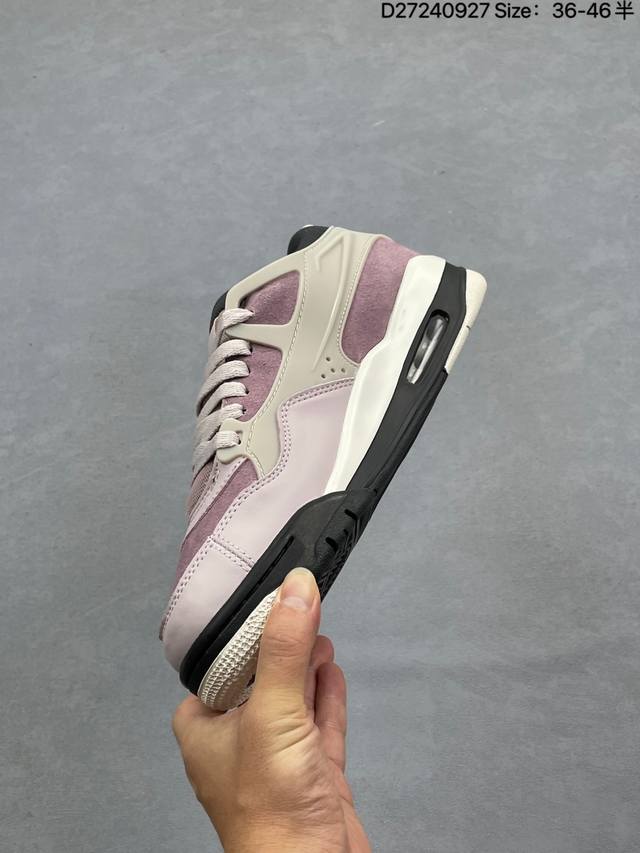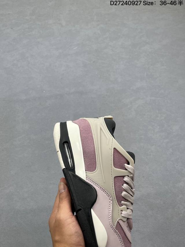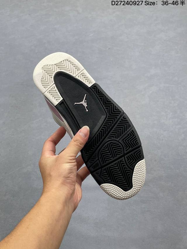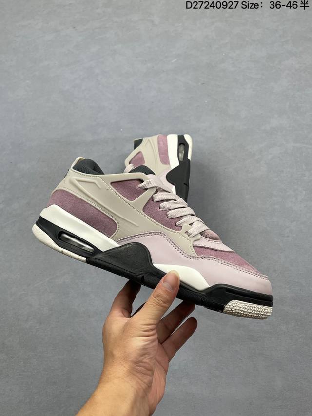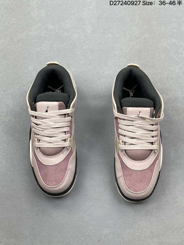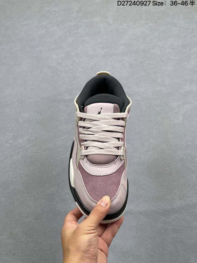 The Air Jordan 4 Rm Gs Aj4 Jordan 4 generation Aj4 Jordan 4 Light Ivory Jordan basketball shoe series is crafted from leather and suede. The upper utilizes white leather as the primary frame, with a gray leather frame overlay at the toe. While retaining the classic Air Jordan 4 shape, the original mesh has been removed. Paired with white laces, the shoe's overall look is more cohesive. The tongue tag features a white Jumpman logo and "Flight" branding, highlighting the shoe's identity. Off-white TPU material is used on the upper and heel tabs, adding a touch of color. The heel features a blue Nike Swoosh logo and Air. The midsole continues the previous model's use of a split, visible Air Sloet unit. A lavender midsole and off-white rubber outsole with a pink Jumpman logo complete the design.