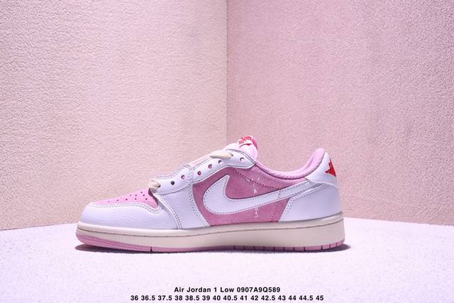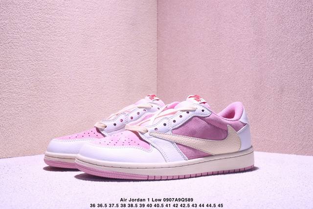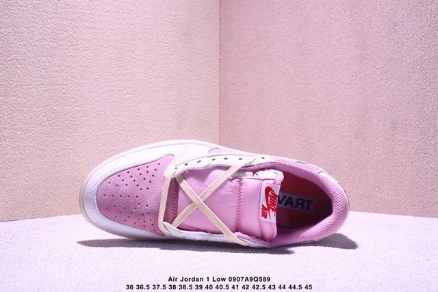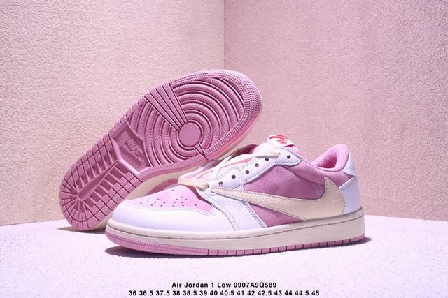 Travis Scott x Air Jordan 1 Low low-top white and pink inverted hook joint Aj1 Jordan 1 generation Aj1 Joe 1 low-top white and pink inverted hook joint Jordan basketball shoe series shoe body continues the previous design, with the whole body covered with suede material to create an excellent texture; in terms of color matching, it is presented with a pink base and a white frame. The iconic inverted hook Swoosh Logo is presented in off-white, and the medial side is supplemented with a white Swoosh Logo embellishment. Many Ts iconic elements such as the tongue are retained; the white embroidered label on the tongue is embellished with a red Nike Swoosh Logo, the Cactusx Jackx brand logo on the inside of the shoe body is embellished with red, and the ghost face logo and Wings Logo on the heel are both made of red stitching to highlight the joint identity; the midsole also uses an oxidized distressed effect, and the outsole is finished with pink rubber to complete the overall design.