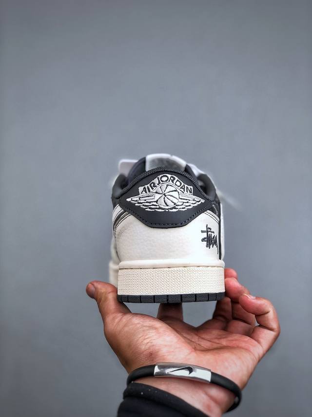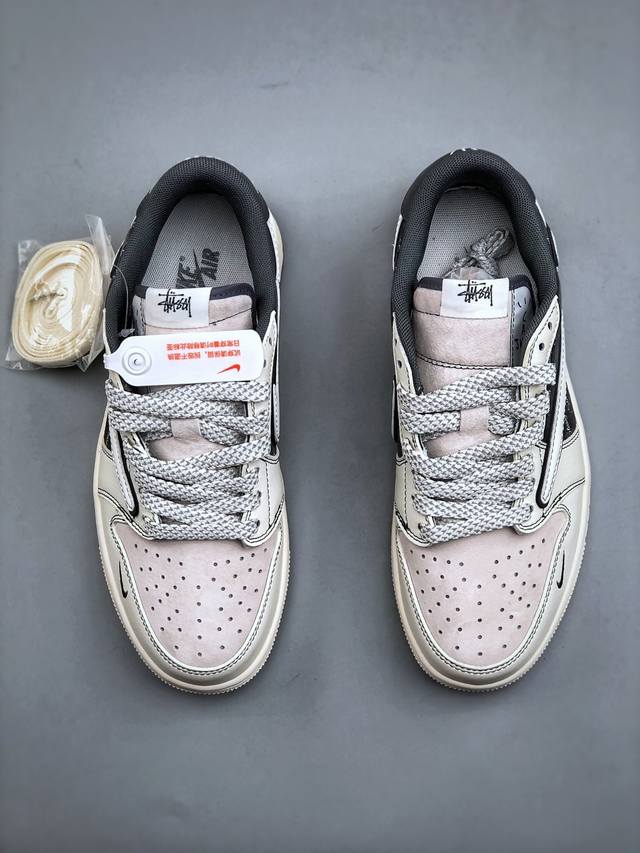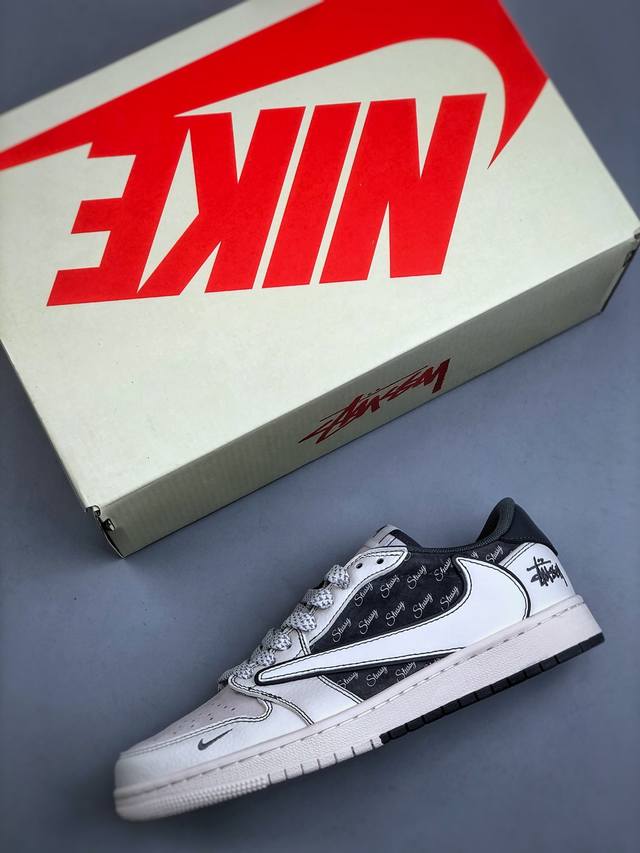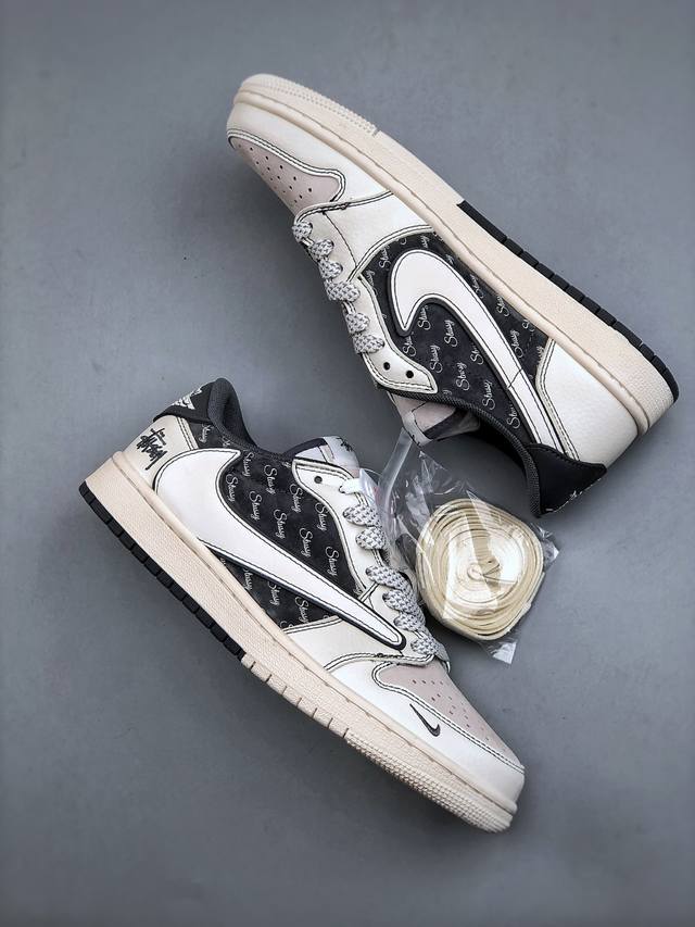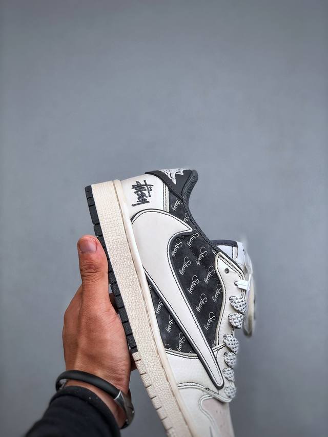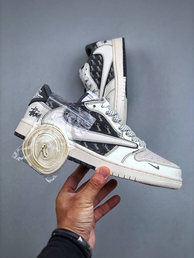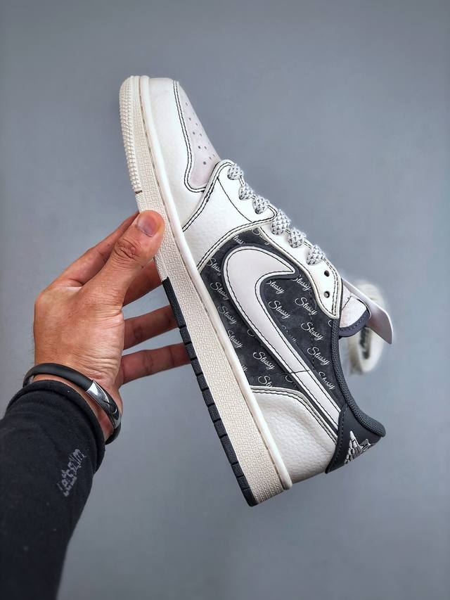 Travis Scott x Fragment Design x Jordan Air Jordan 1 Low Og Sp "Stussy Joint White and Gray English Double Pinyin" multi-party collaboration combines Travis Scott's unique musical style, Fujiwara Hiroshi's individual design style, and classic elements of the Jordan brand, making it a pair of shoes with unique identity and value. The fresh and three-dimensional appearance, coupled with the joint logo, further highlights its unique identity. This color scheme shows vitality and fashion sense, which is visually eye-catching. The texture and exquisite details of the shoe body make it look high-end and stylish. This "reverse hook" collaboration is a perfect combination of design and creativity, integrating the individual styles of multiple parties. It is a highly anticipated trendy low-top casual sneaker. Custom shoe box, shipped by a large factory with pure original quality, ultra-high cleanliness, clean leather cut without any burrs, and perfect details.