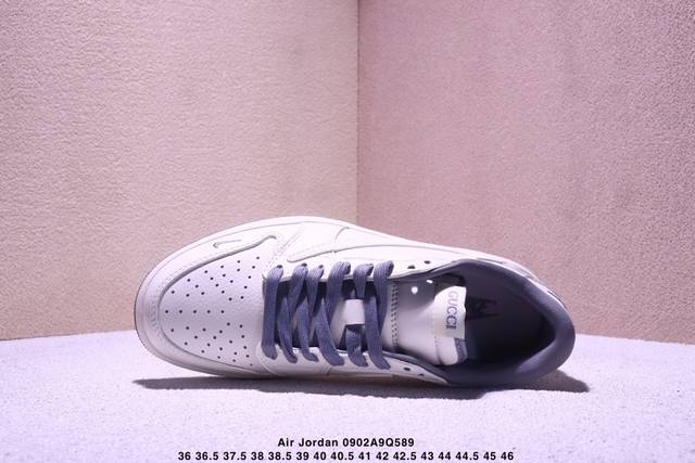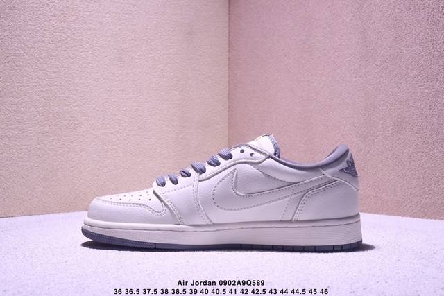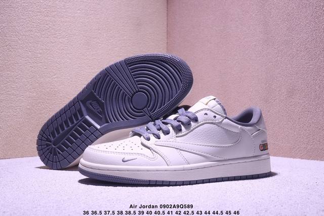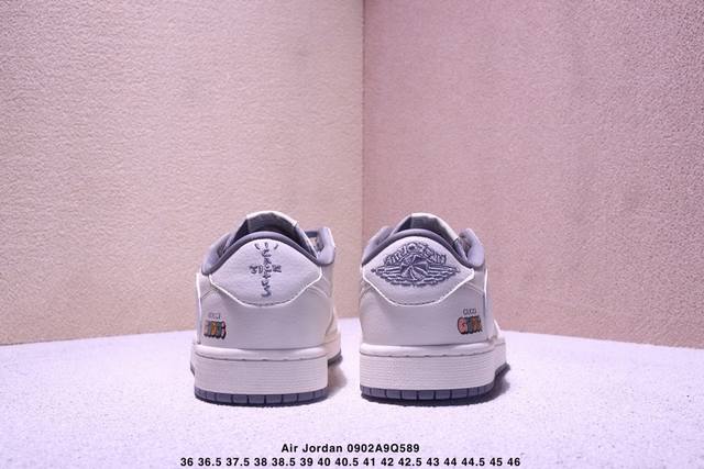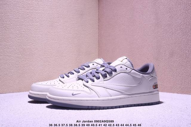Travis Scott X Fragment X Air Jordan 1 Low Ogts Fujiwara Hiroshi three-party joint inverted hook The new three-party joint low-top inverted hook upper continues the black toe design. The whole pair of shoes is made of full lychee leather, with a white inverted hook on the waist and embellished with Travis Scott's iconic Logo. The heel is based on Fujiwara Hiroshi's most adept blue, completing the white, blue and black design style of Fragment Design. The left and right feet are decorated with Travis Scott's ghost face and Jordan's flying wing respectively, highlighting the luxurious style of the three-party joint.