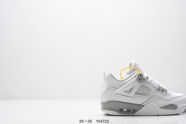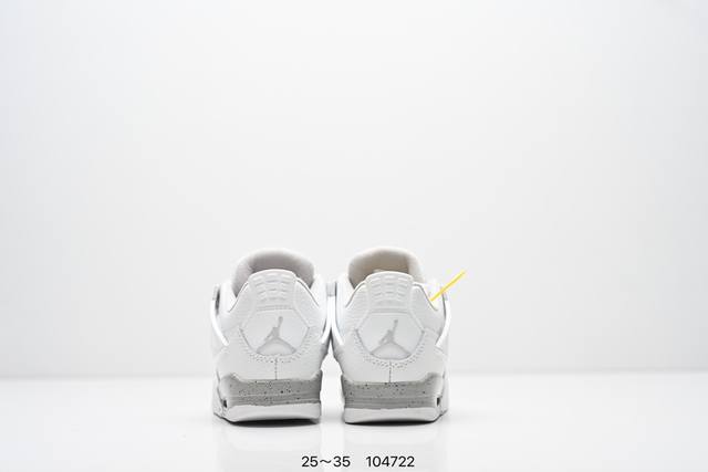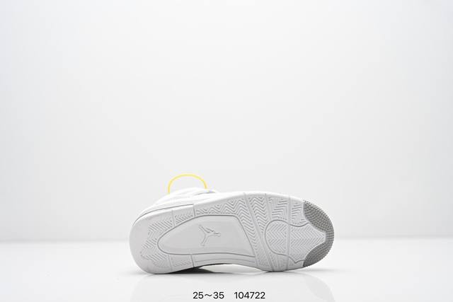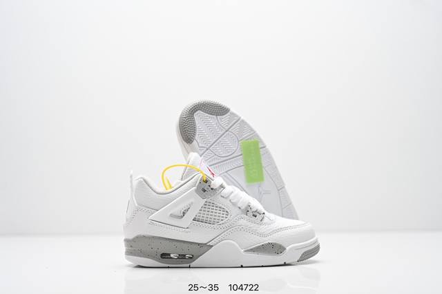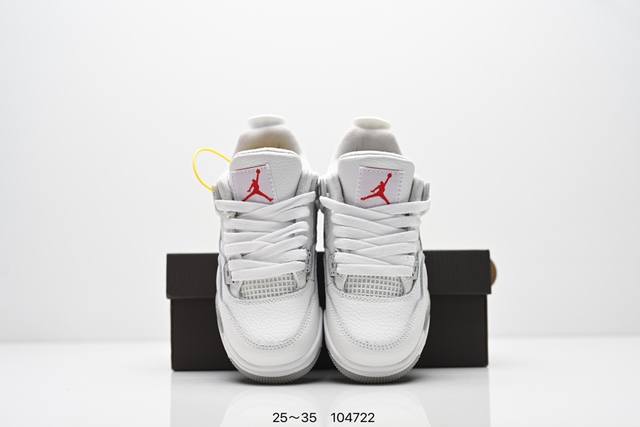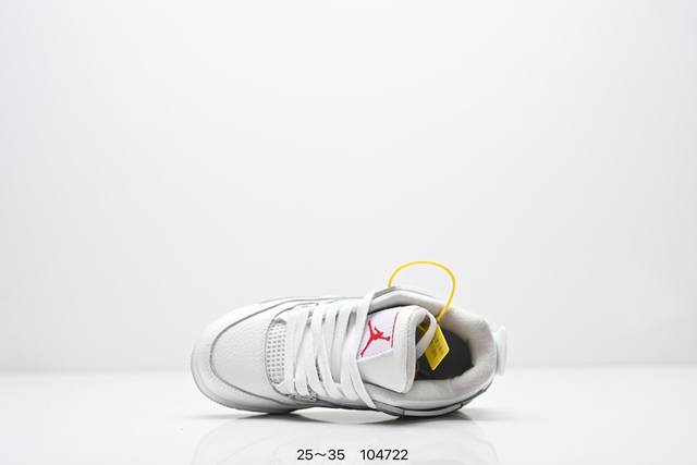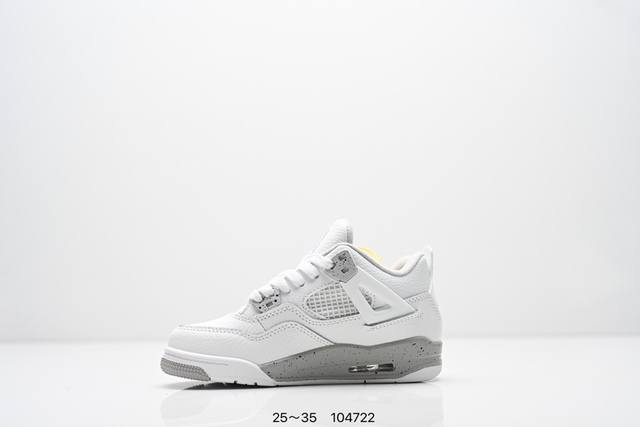 Kids' Nike Air Jordan 4 (AJ4) Retro Casual Sports Basketball Shoes. Adhering to the design philosophy of lightweight speed basketball shoes, this shoe reduces weight while improving comfort. The midsole continues the use of a split, visible Air Sole unit in the heel. The lacing eyelets and heel pull tab are inspired by basketball nets, cleverly integrating basketball into the shoe's design, giving it a fluid, rhythmic, and elegant feel. Product Code: Ct8527 Sizes: 25-35 Code: 104722