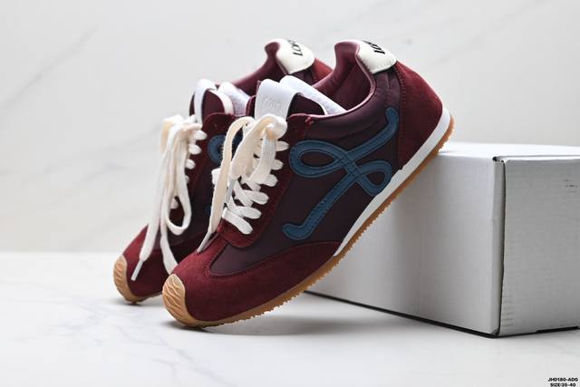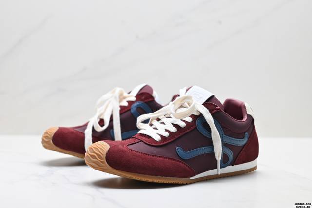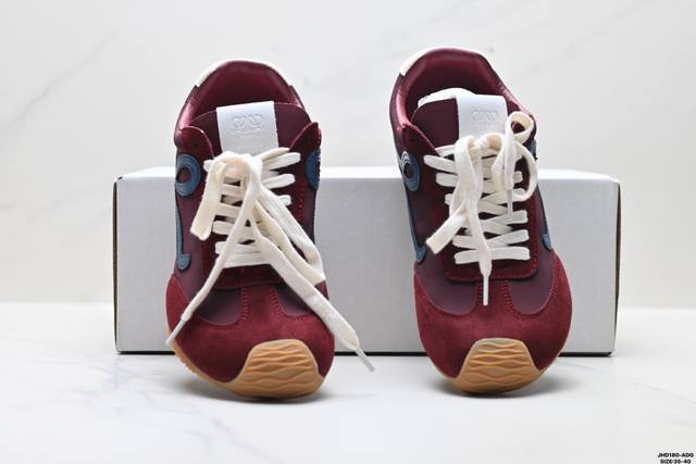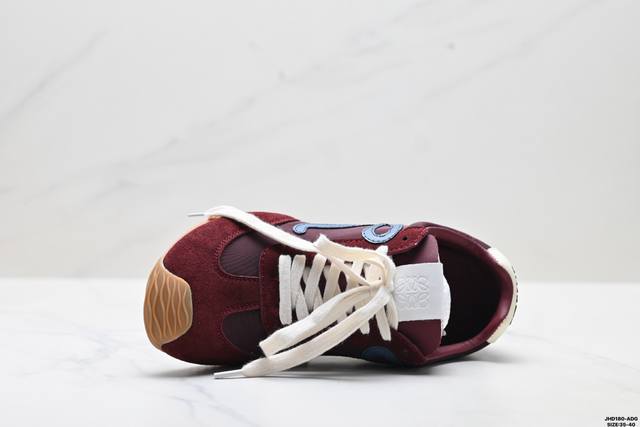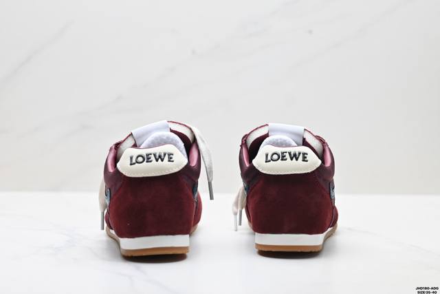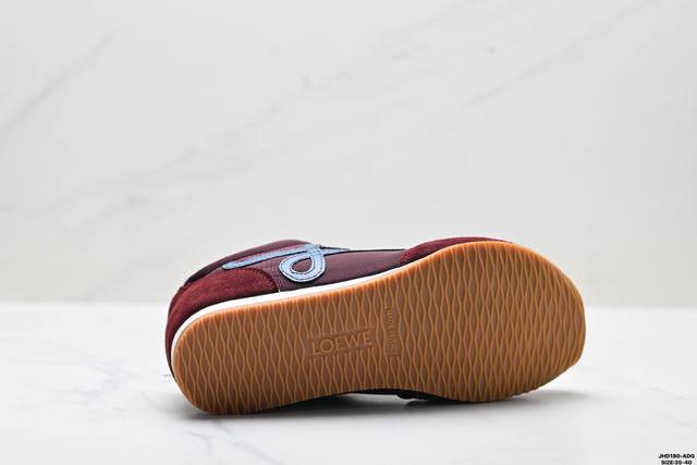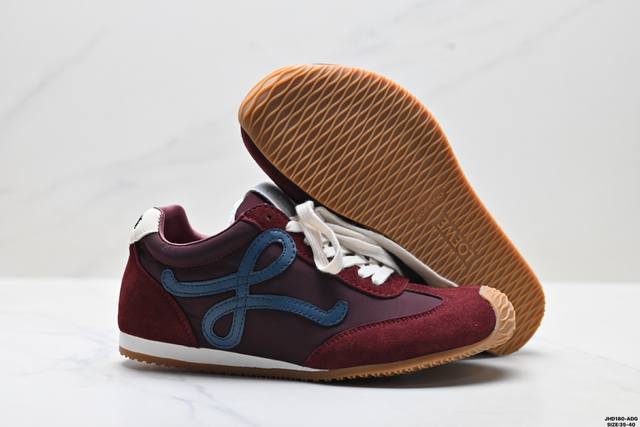 Company Grade Loewe Ballet Runner 2.0 Sneakers Series, Retro Style, German Training, Thin Sole, Versatile Casual Sports Shoes. Made in Guangdong, genuine original factory, asymmetrical toe design, sock-like internal structure, lightweight rubber outsole extending to the toe , heel label adorned with injection-molded rubber Loewe logo. Max Recommended Version, upgraded original last, paper pattern development, fully handmade lasting process, suede cowhide leather with layered leather trim, original high-density scratch-resistant nylon upper material, excellent softness, double-layer latex cushioning insole, lightweight EVA cushioning combination rubber anti-slip outsole. Sizes: 35-40. ID: J hd180-Adg.