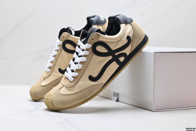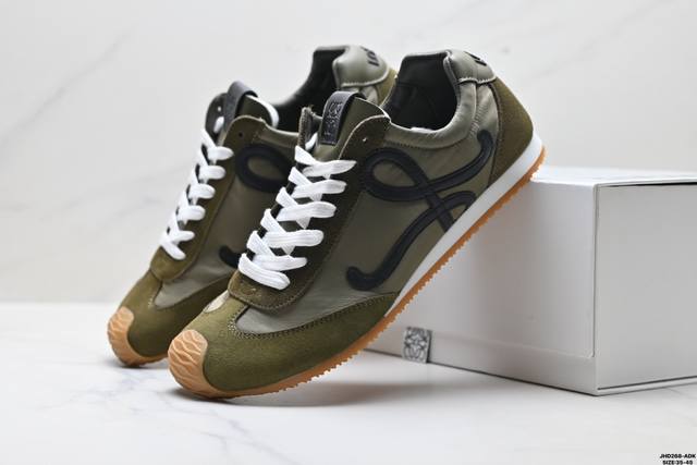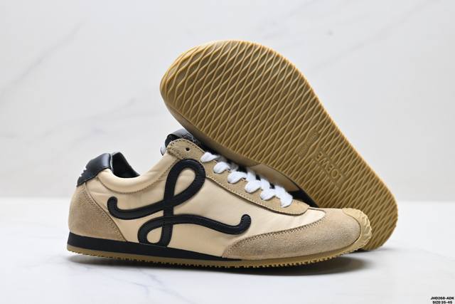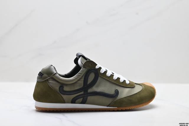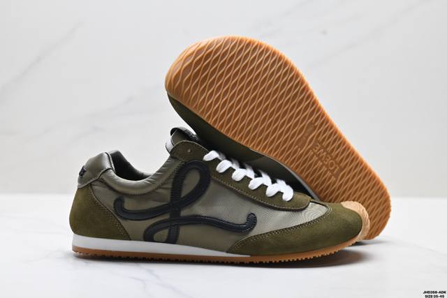 Company Grade Loewe Ballet Runner 2.0 Sneakers Series, Retro Style, German Training, Thin Sole, Versatile Casual Sports Shoes. Made in Guangdong, genuine original factory, asymmetrical toe design, sock-like internal structure, lightweight rubber outsole extending to the toe, heel label adorned with injection-molded rubber Loewe logo. Max Recommended Version, upgraded original last, paper pattern development, fully handmade lasting process, suede cowhide leather with layered leather trim, original high-density scratch-resistant nylon upper material, excellent softness, double-layer latex cushioning insole, lightweight EVA cushioning combination rubber anti-slip outsole. Sizes: 35-45. ID: J hd268-Adk.