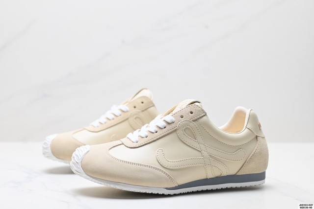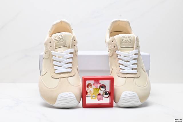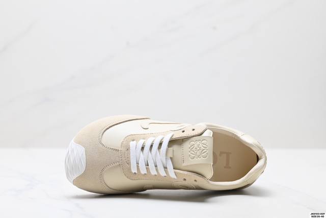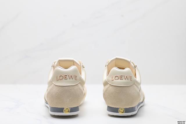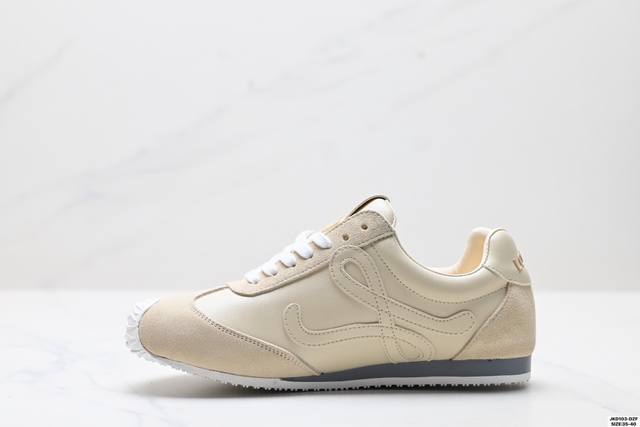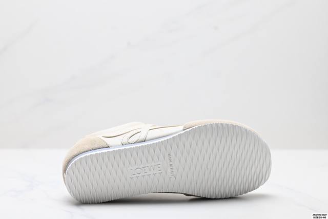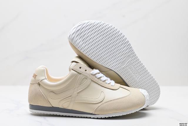 Company Grade Loewe Ballet Runner Sneakers Series, Retro Style, German Training, Thin Sole, Versatile Casual Sports Shoes. Made in Guangdong, this original factory features an asymmetrical toe design, sock-like internal structure, lightweight rubber outsole extending to the toe, and a heel tag adorned with the injection-molded rubber Loewe logo. Max Recommended Version, upgraded with original last design, paper pattern, and fully handcrafted upper made with suede cowhide and layered leather trim. The upper is made of original high-density scratch-resistant nylon fabric with excellent softness. It features a double-layer latex cushioning insole with lightweight EVA cushioning and a rubber anti-slip outsole. Sizes: 35-40. ID: Jkd10 3-Dzf.