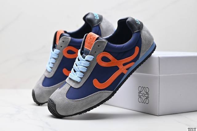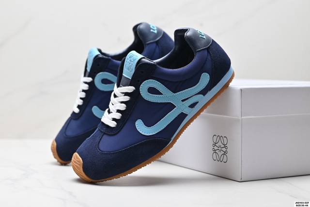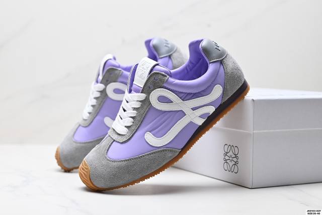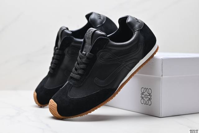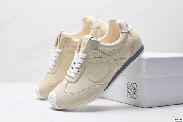 Company-grade Loewe Ballet Runner Sneakers Series, Cornetto Retro Style, German Training Thin-Soled Versatile Casual Sports Shoes. Made in Guangdong, this original factory features an asymmetrical toe design, sock-like internal structure, lightweight rubber outsole extending to the toe, and a heel tag adorned with the injection-molded rubber Loewe logo. Max recommended version upgraded from the original last, developed using a paper pattern and fully handcrafted lasting process. The upper is made of suede cowhide with layered leather trim. The upper material is original high-density scratch-resistant nylon fabric with excellent softness. It features a double-layer latex cushioning insole with lightweight EVA cushioning and a rubber anti-slip outsole.