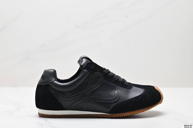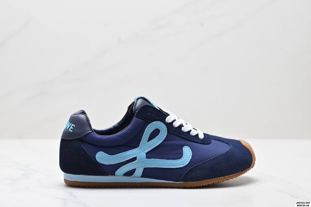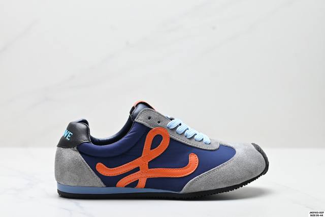 Company-grade Loewe Ballet Runner Sneakers Series, Retro Style, German Training, Thin Sole, Versatile Casual Sports Shoes. Made in Guangdong, this original factory features an asymmetrical toe design, sock-like internal structure, lightweight rubber outsole extending to the toe, and a heel tag adorned with the injection-molded rubber Loewe logo. Max recommended version, upgraded with original last development, paper pattern, hand-stitched construction, suede cowhide leather with layered leather trim, original high-density scratch-resistant nylon upper material for excellent softness, double-layer latex cushioning insole, lightweight EVA cushioning combination, and rubber anti-slip outsole. ID: Jkd103-Dzf