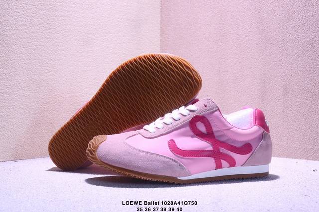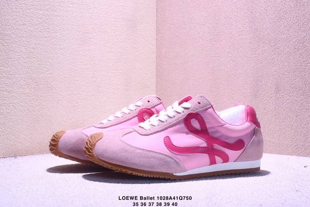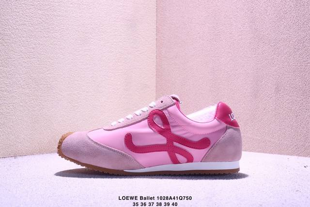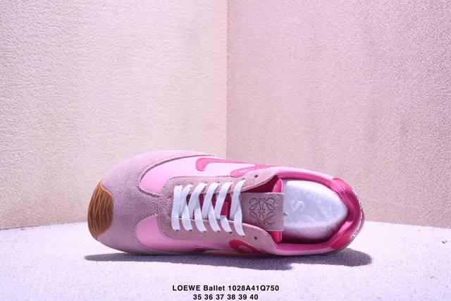 Loewe Ballet Runner 2.0 calfskin round-toe lace-up low-top casual shoes. The new Loewe Ballet Runner 2.0 sneakers have won the favor of the fashion world with their unique design and comfort. The shoe features a playful toe design and an equally innovative, soft, and comfortable heel, hailed as the most comfortable walking shoe of the year. Wearing them feels like walking on flat ground, allowing you to easily enjoy the fun of exercise. The shoe's simple and clean silhouette, low-top design, and the brand's initials on the side reveal the brand's high quality in the details. These shoes are not only comfortable but also highly versatile, showcasing a unique sense of style for both everyday outings and sports occasions. Inspired by ballet flats and 1970s footwear, the perfect combination of retro elements and modern design makes them instantly captivating. Once you wear these Loewe Ballet Runner sneakers, you'll fall in love with them and never want to try any other athletic shoes again. Item Number: L814282X02 Size: As shown in the picture Xm1028Q750