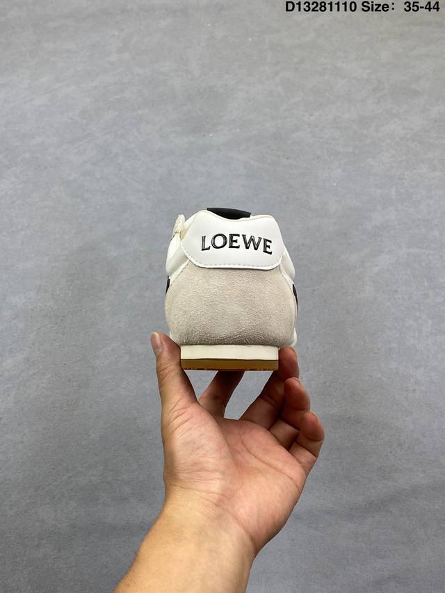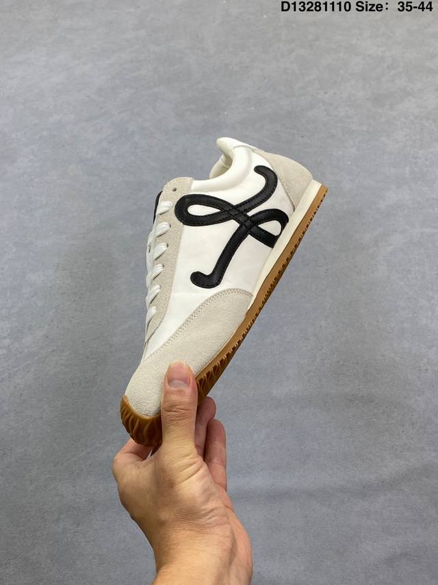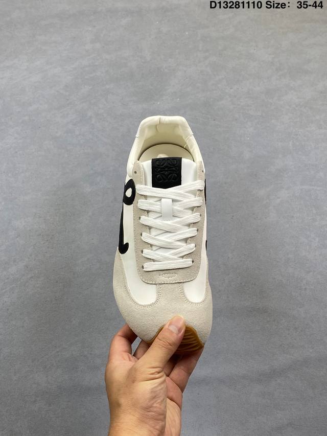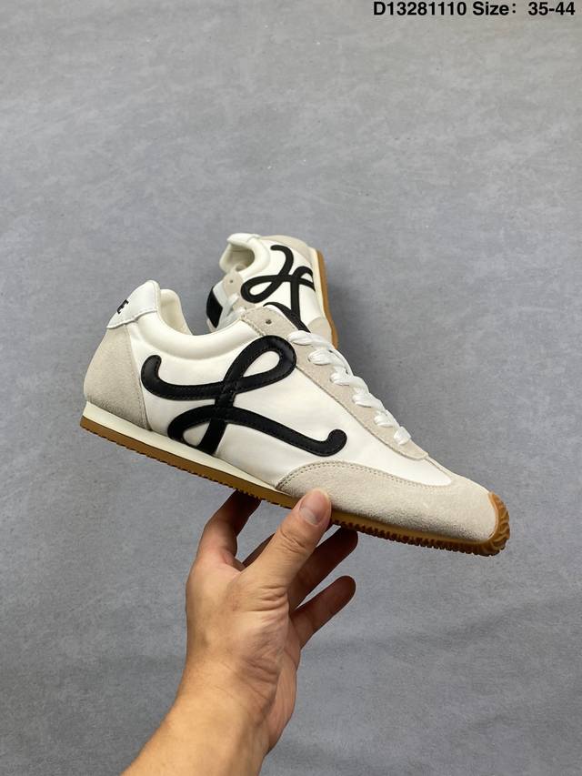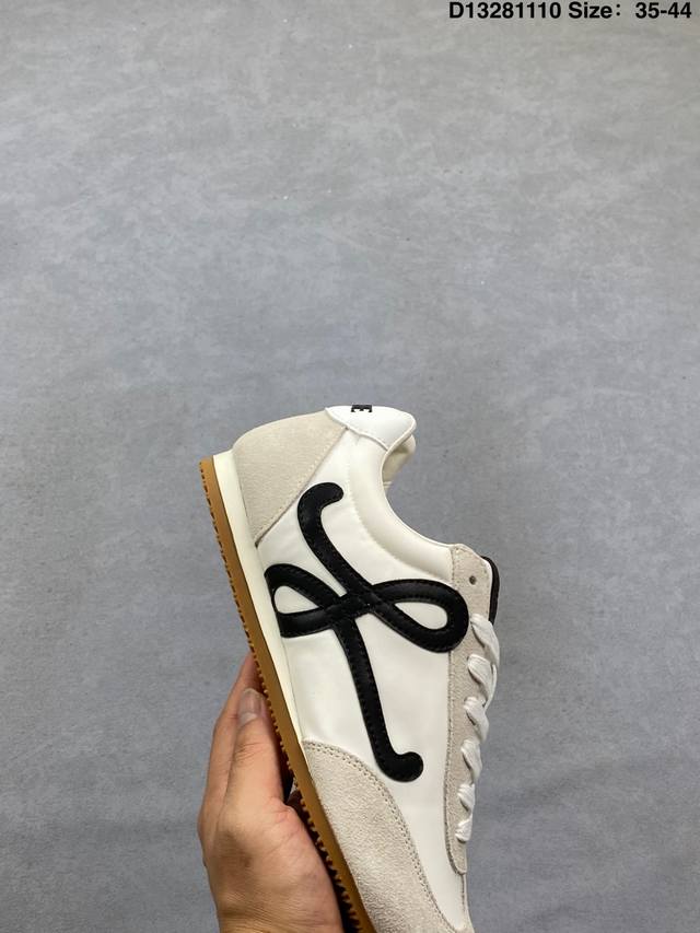 Loewe Ballet Runner Leather and Fabric Patchwork Simple Round Toe Lace-up Low-top Sporty Casual Shoes. This shoe is Loewe's newly released Ballet Runner 2.0, hailed as a "girl-killer sneaker." Fashion and comfort coexist! Are you also attracted to Loewe's classic Cortez shoes? This shoe is not only stylish but also incredibly comfortable, looking great with any type of pants! This is a best-selling shoe; its key to its popularity lies in its toe design. Based on the German training shoe, the toe is twisted to form an asymmetrical T-shape, looking very interesting, rounded, and cute. It sold out immediately upon release. Sizes: 35-44 Code: D13 281110