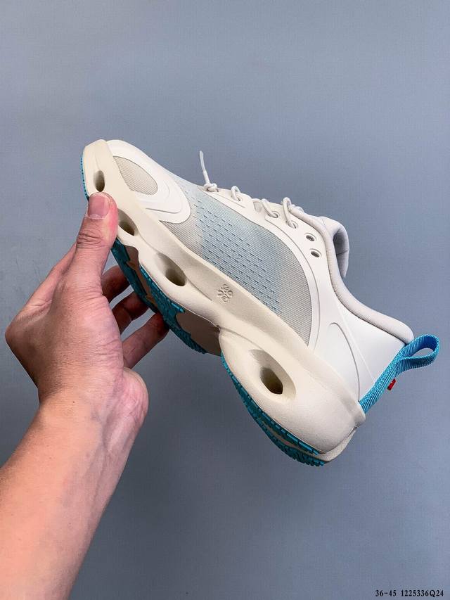 Loewe X On's new Cloudsolo collaboration series of cushioned and breathable casual sneakers. The upper features On's technical mesh fabric, paired with adjustable straps printed with Loewe's classic "pebble" pattern. Collaboration logos are visible throughout the tongue and shoe body. The midsole features On's Cloudtec cushioning technology, combined with Helion super foam and Speedboard structure, ensuring both everyday comfort and sufficient support and rebound. (Ddd 1225336Q24)