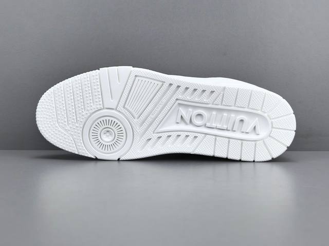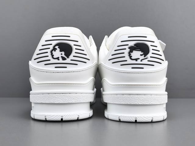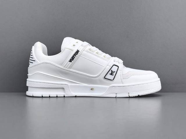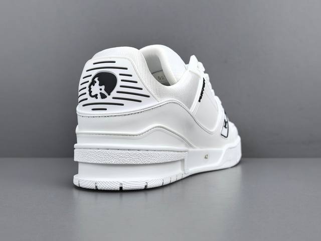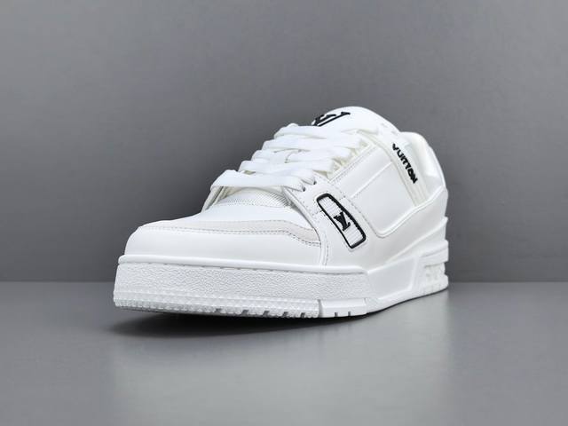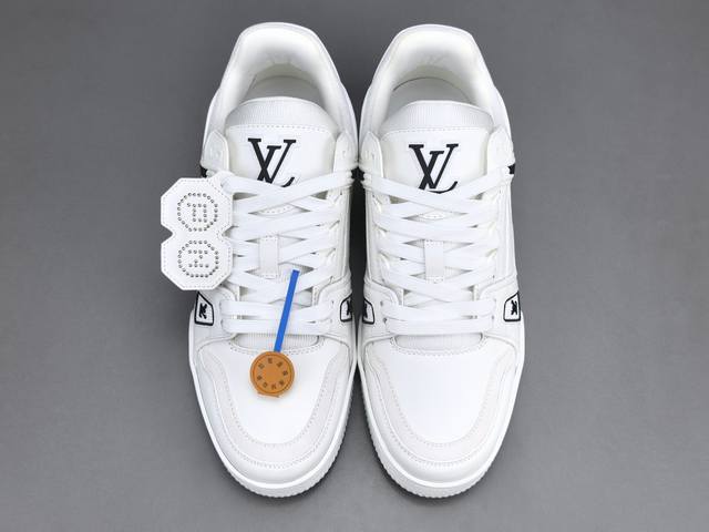 Counter-exclusive Louis Vuitton x Nigo collaboration Trainer Fw25 low-top cowhide leather round-toe lace-up sneakers for men in beige gray.