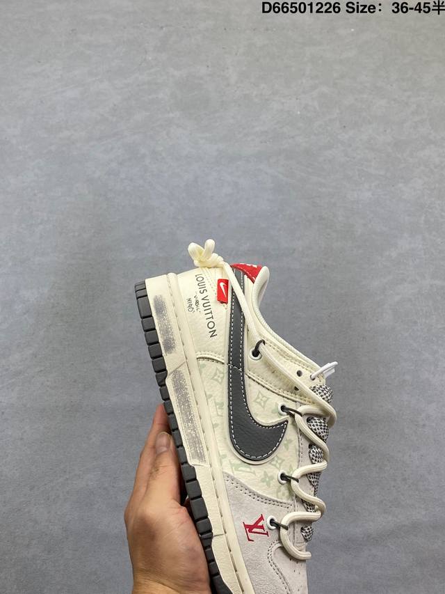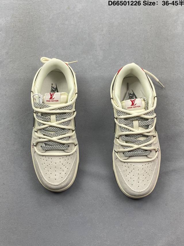 Collaborative Deconstructed Version | A Clash of Top Trends! When the streetwear DNA of the Swoosh meets the luxury heritage of LV, this Cx5050-Y51 instantly elevates its trendsetting appeal! A light-toned monogram print is overlaid on a cream-colored suede base, while the grey-toned Swoosh distressed deconstruction design breaks with convention. The Louis Vuitton lettering on the side and the red LV logo add a striking contrast, and the red tag detail at the heel further enhances the design. From the shoe's lines to the material combinations, every detail blends the classic silhouette of the Dunk with the luxurious feel of LV. This collision of streetwear coolness and high-end fashion makes it an instant head-turner, a must-have for any fashionista's collection! Product Code: Cx5050 Sizes: 36, 36.5, 37.5, 38, 38.5, 39, 40, 40.5, 41, 42, 42.5, 43, 44, 44.5, 45 Code: D66501226