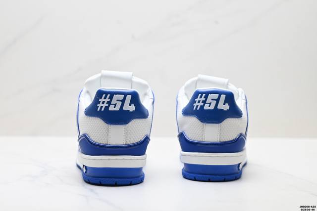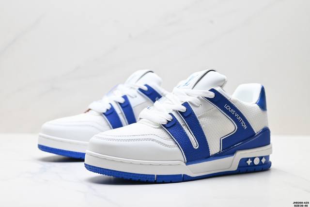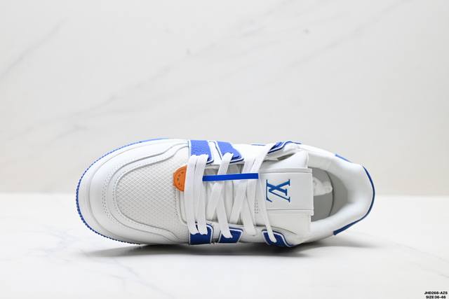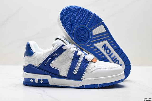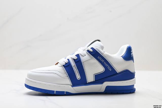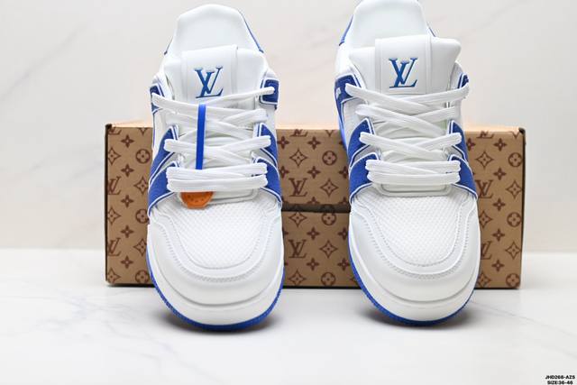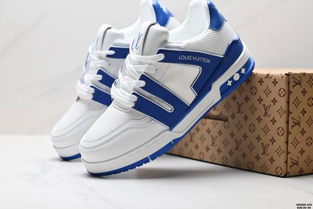 Company Grade Louis Vuitton Trainer Sneaker Low. A versatile and comfortable sneaker with a non-slip sole, perfect for any fashion and entertainment industry. Details meticulously refined for a perfect fit. The upper is made of soft leather with an exclusive mold. The outsole features a 3D-printed iconic logo on the side, exuding aristocratic style. Comes with authentic packaging. Sizes: 36-46. ID: Jhd268-Azs.