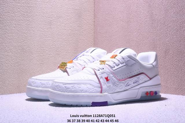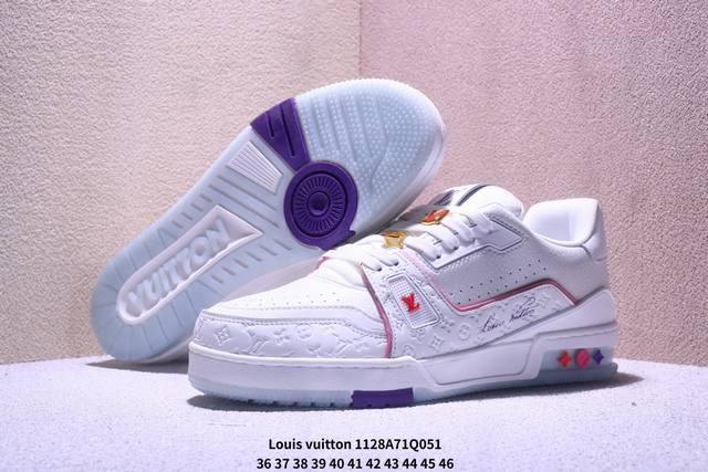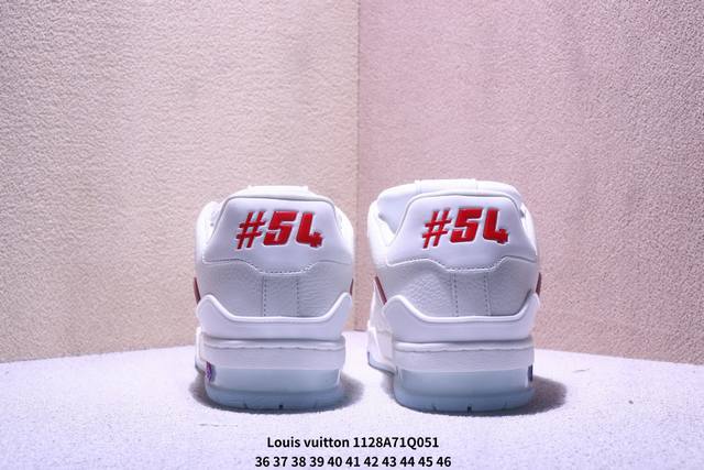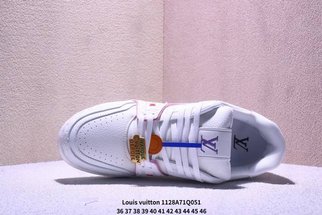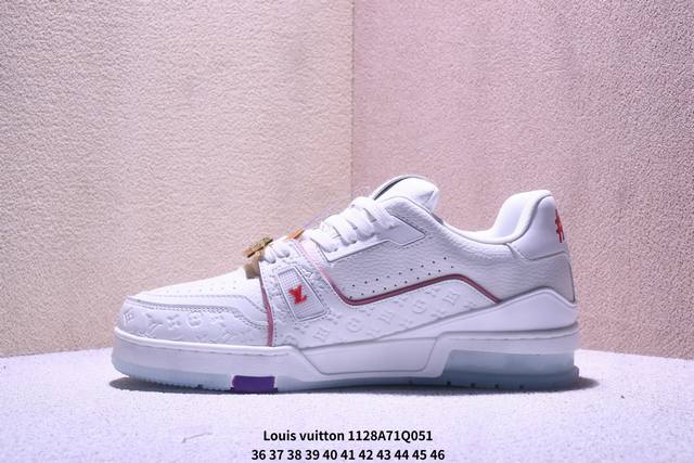 Company Grade Louis Vuitton Trainer Sneaker Low. A versatile and comfortable sneaker with a non-slip sole, perfect for any fashion and entertainment industry. Details meticulously refined for a perfect fit. The upper is made of soft leather with an exclusive mold. The outsole features a 3D-printed iconic logo on the side, exuding aristocratic style. Comes with authentic packaging. Sizes: 36-46. Xm1128Q051