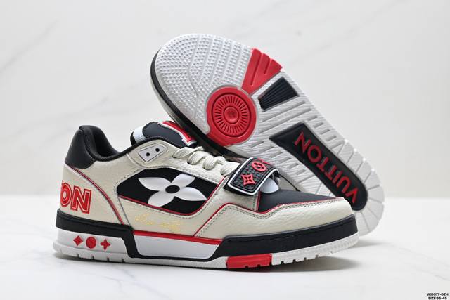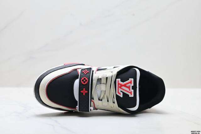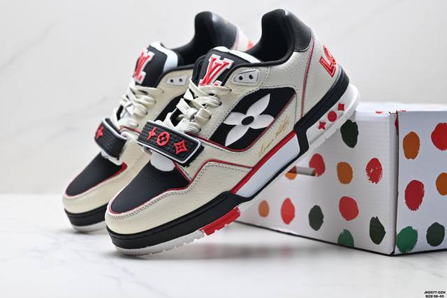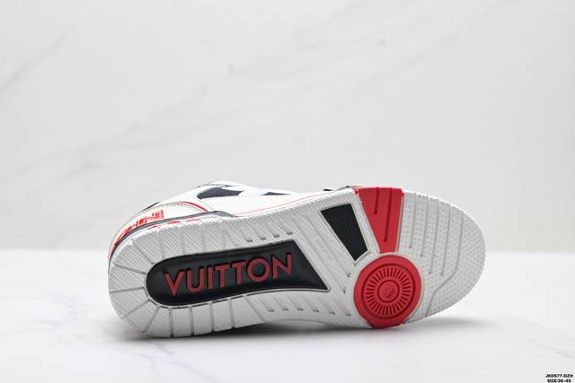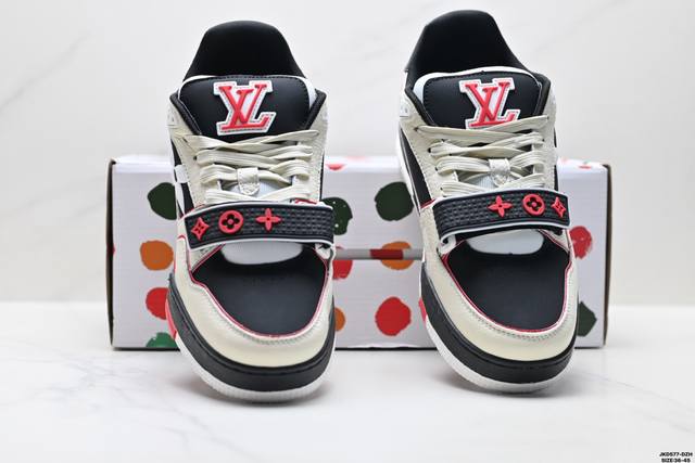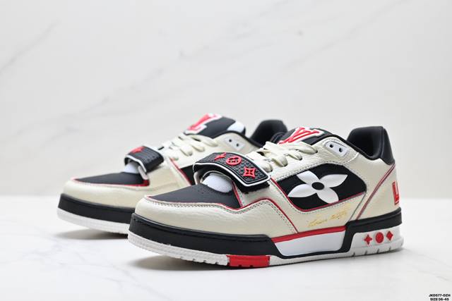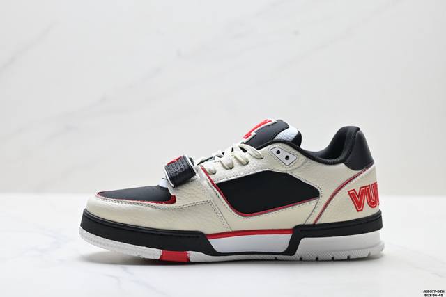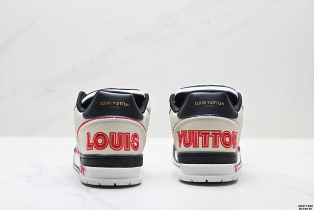 Company Grade Louis Vuitton Trainer Sneaker Low. A versatile and comfortable sneaker with a non-slip sole, perfect for any fashion and entertainment industry. Details meticulously refined. The upper is made of soft leather with an exclusive mold. The outsole features a 3D-printed iconic logo on the side, exuding a noble and fashionable feel. Comes with authentic packaging. Sizes: 36-45. ID: Jkd577-Dzh