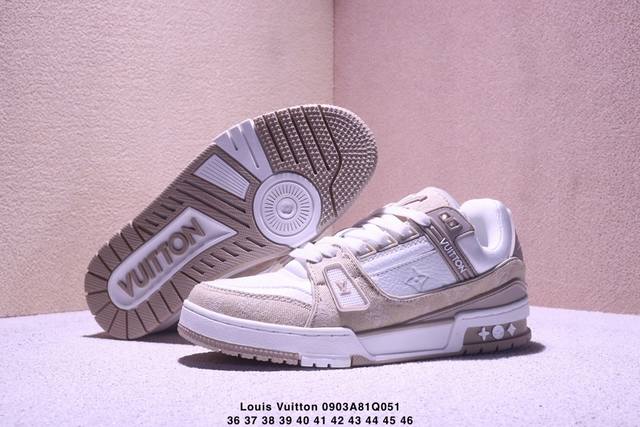 New LV Trainer sneakers in the latest colorway. L's basketball-style sneakers. Designed by artistic director Virgil Abloh, the shoes feature a footbed made of polyamide micro-material and breathable British mesh detailing. Sizes: 36-45