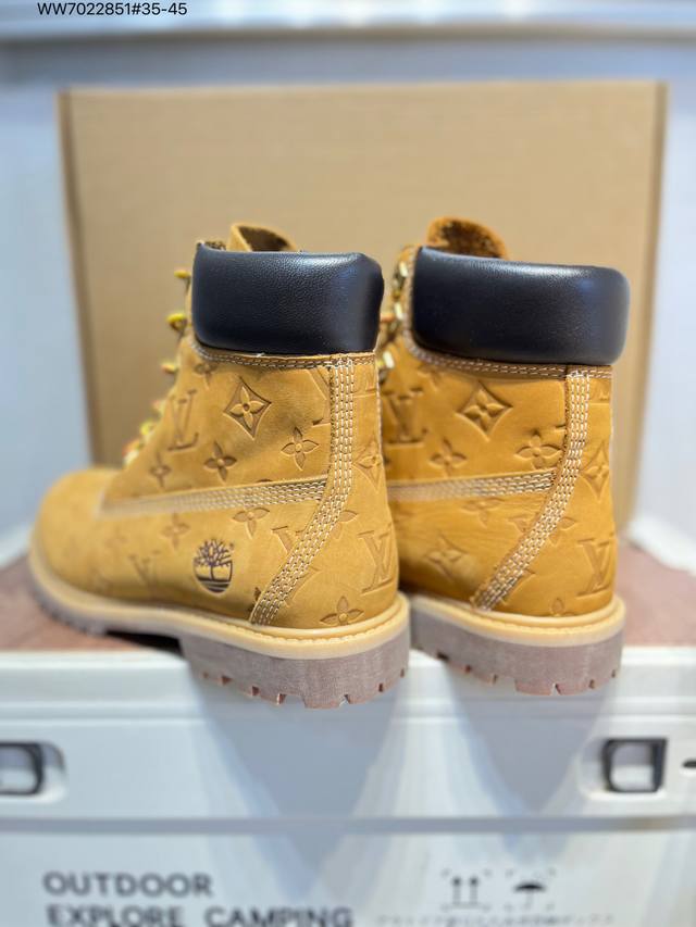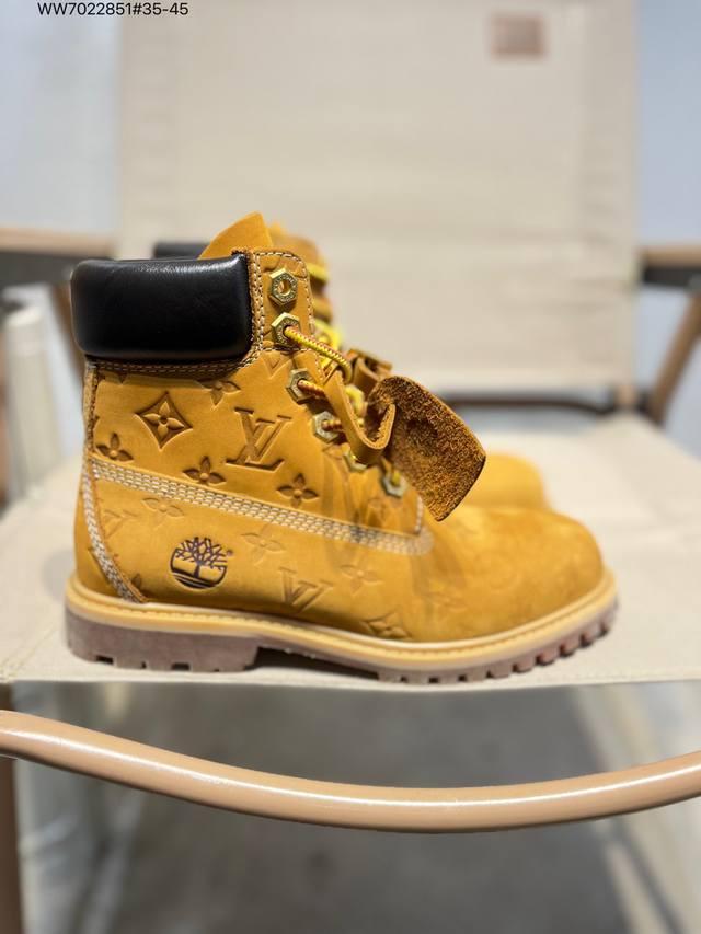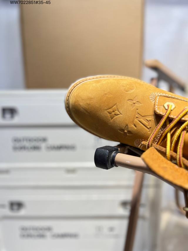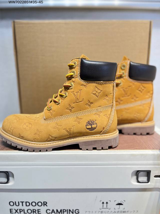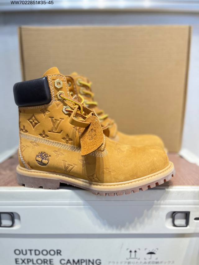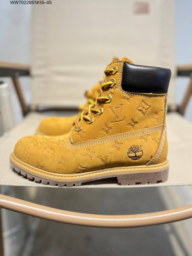 Factory direct, independent mold, correct version, extremely low production volume. Timberland X Louis Vuitton Lv collaboration boots. Timberland 6-inch all-over monogram waterproof boots. Original factory hardware, molded shoelace buckles, top-notch craftsmanship, newly upgraded. Foshan factory OEM original single-piece imported waterproof leather. Independent mold outsole, correct logo, not the incorrect version on the market. Original and consistent full top-grain suede collar, full cow lining. Brand new original factory packaging, shoe box, exclusive market supply. Ww7022851# 35-45.