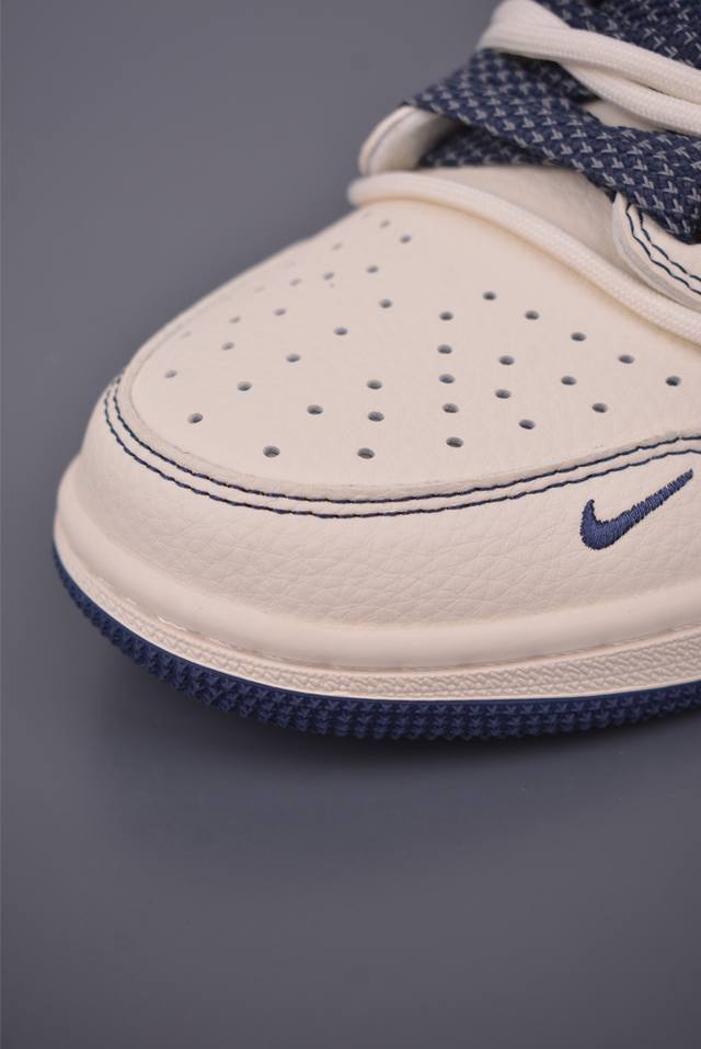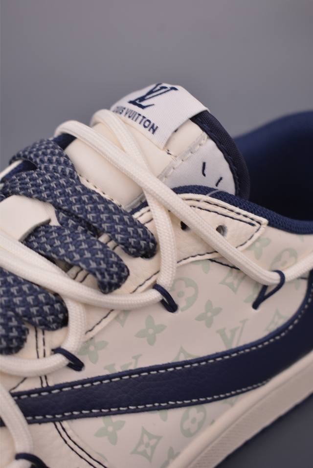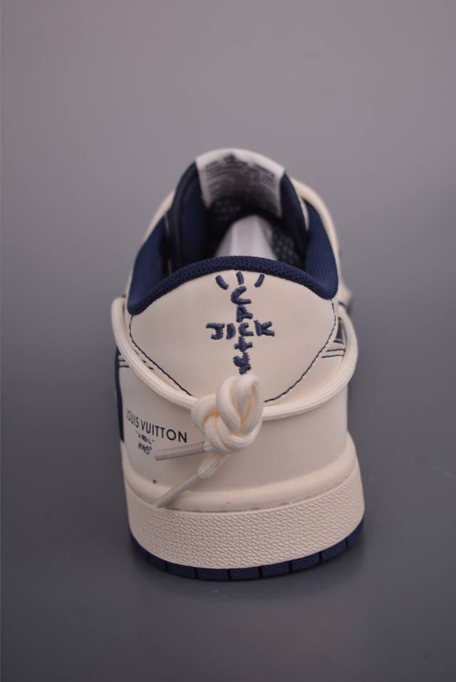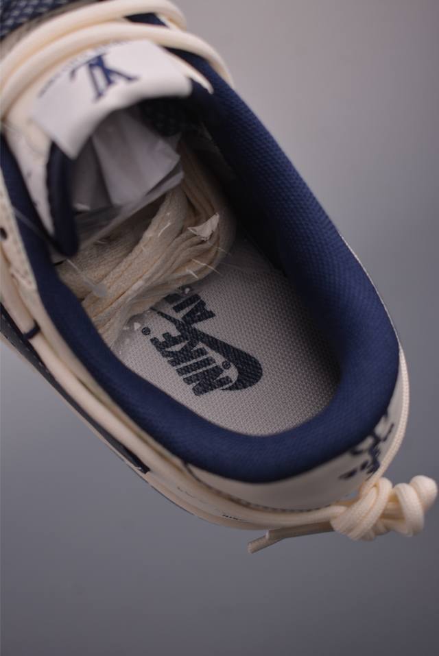 The new three-party collaboration low-top reverse hook upper continues the black toe design. The entire shoe is made of lychee leather, with a white reverse hook waistband and embellished with Travis Scott's iconic logo. The heel is dominated by Fujiwara Hiroshi's most famous blue color, completing the white, blue and black design style of Fragment Design. The left and right feet are decorated with Travis Scott's ghost face and Jordan's flying wings respectively, highlighting the luxurious style of the three-party collaboration.