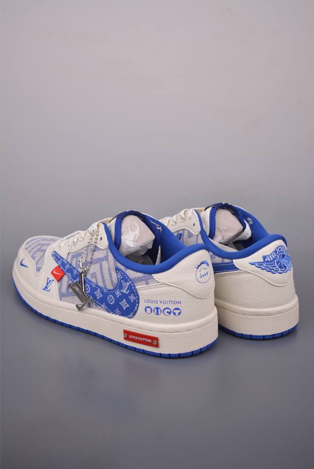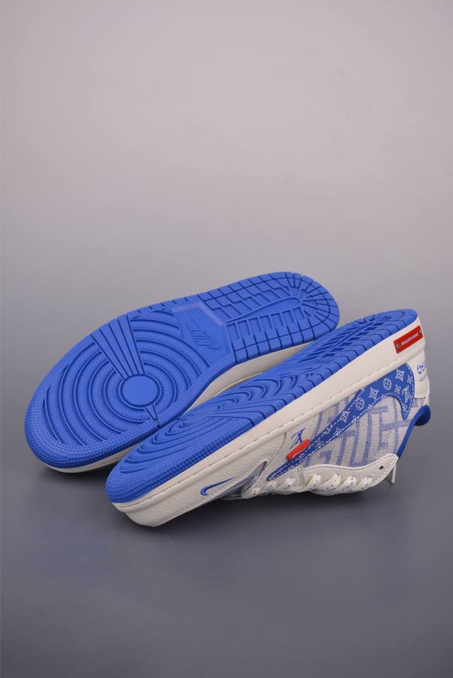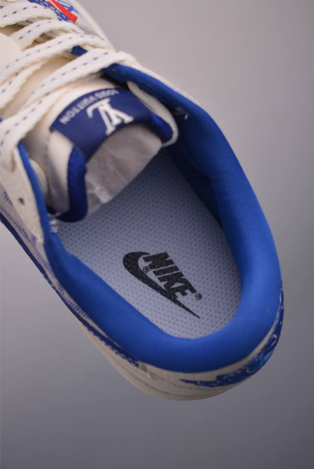The new three-party collaboration low-top inverted hook upper continues the black toe design. The entire shoe is made of lychee leather, with a white inverted hook on the waist and embellished with Travis Scott's iconic logo. The heel is dominated by Fujiwara Hiroshi's most famous blue color, completing the white, blue and black design style of Fragment Design. The left and right feet are decorated with Travis Scott's ghost face and Jordan's flying wings respectively, highlighting the luxurious style of the three-party collaboration.