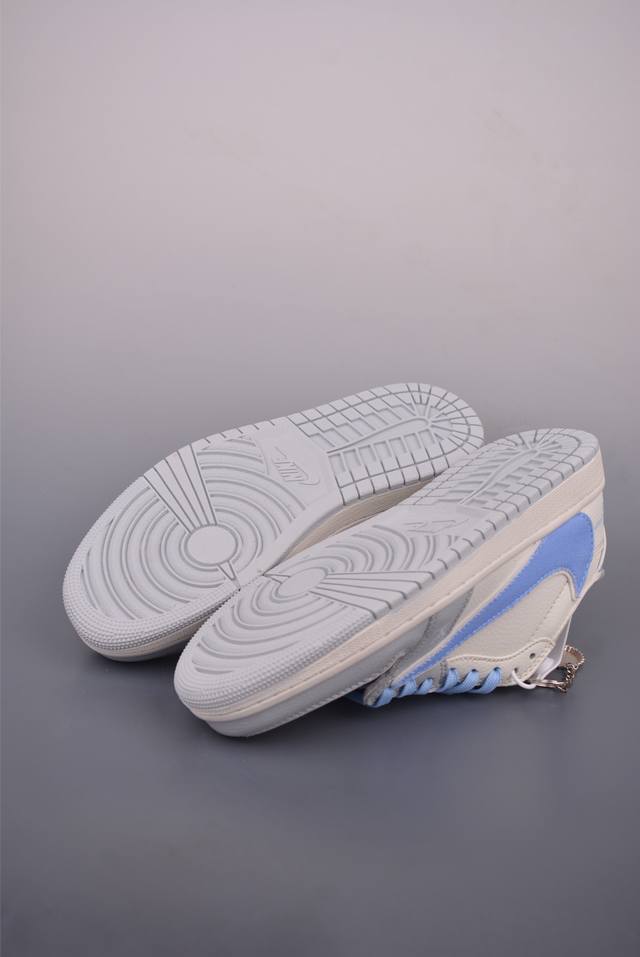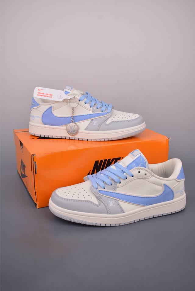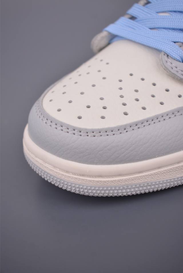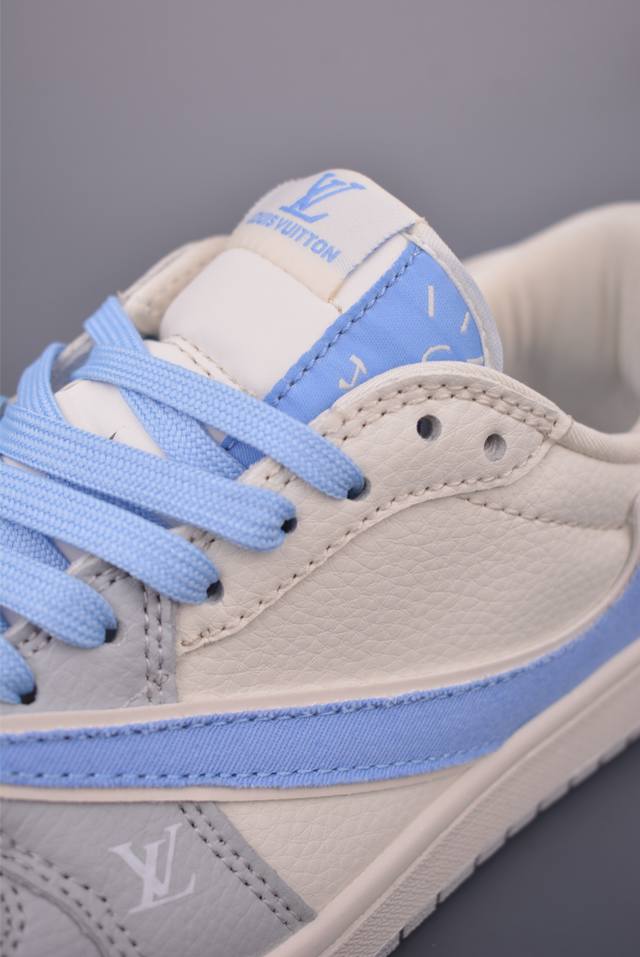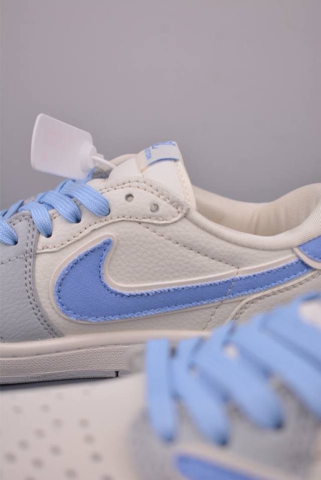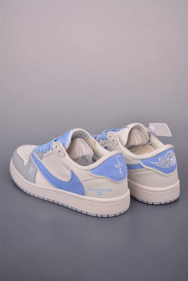 The new three-party collaboration low-top reverse hook upper continues the black toe design. The entire shoe is made of lychee leather, with a white reverse hook waistband and embellished with Travis Scott's iconic logo. The heel is dominated by Fujiwara Hiroshi's most famous blue color, completing the white, blue and black design style of Fragment Design. The left and right feet are decorated with Travis Scott's ghost face and Jordan's flying wings respectively, highlighting the luxurious style of the three-party collaboration.