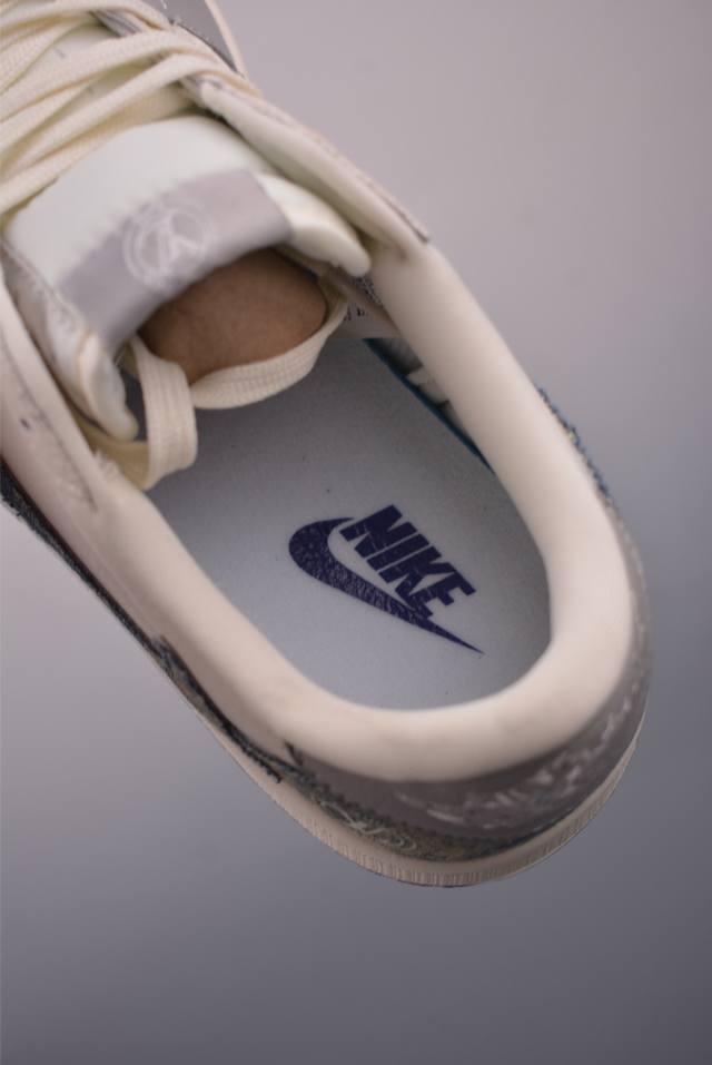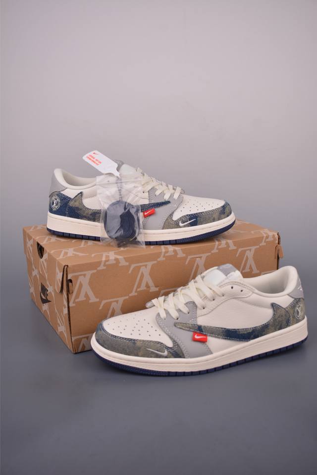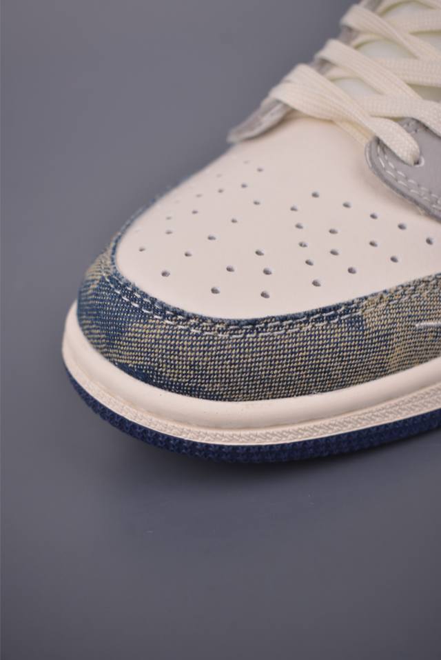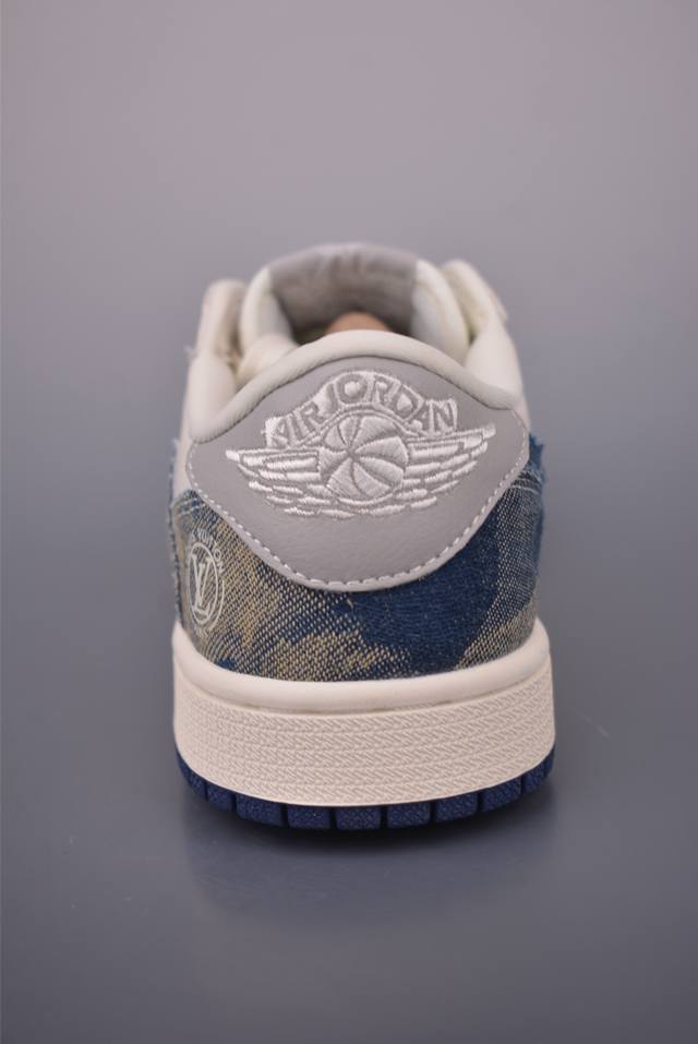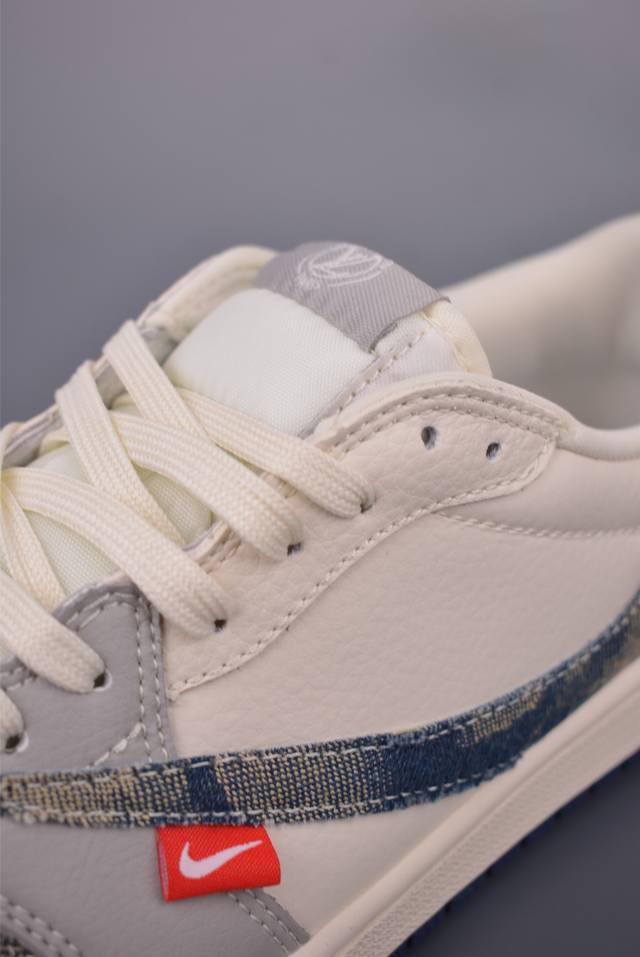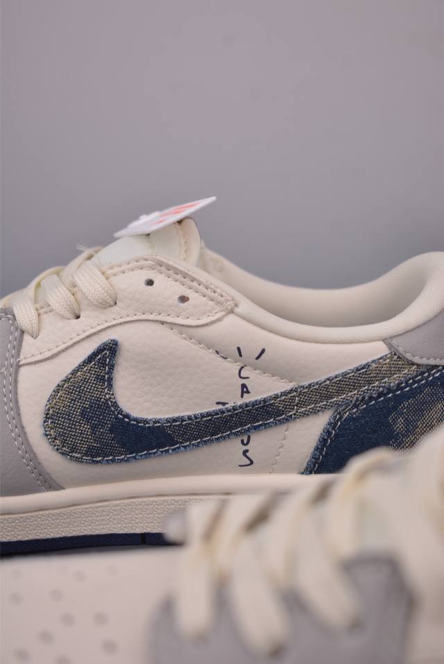 The new three-party collaboration low-top inverted hook upper continues the black toe design. The entire shoe is made of lychee leather, with a white inverted hook on the waist and embellished with Travis Scott's iconic logo. The heel is dominated by Fujiwara Hiroshi's most famous blue color, completing the white, blue and black design style of Fragment Design. The left and right feet are decorated with Travis Scott's ghost face and Jordan's flying wings respectively, highlighting the luxurious style of the three-party collaboration.
