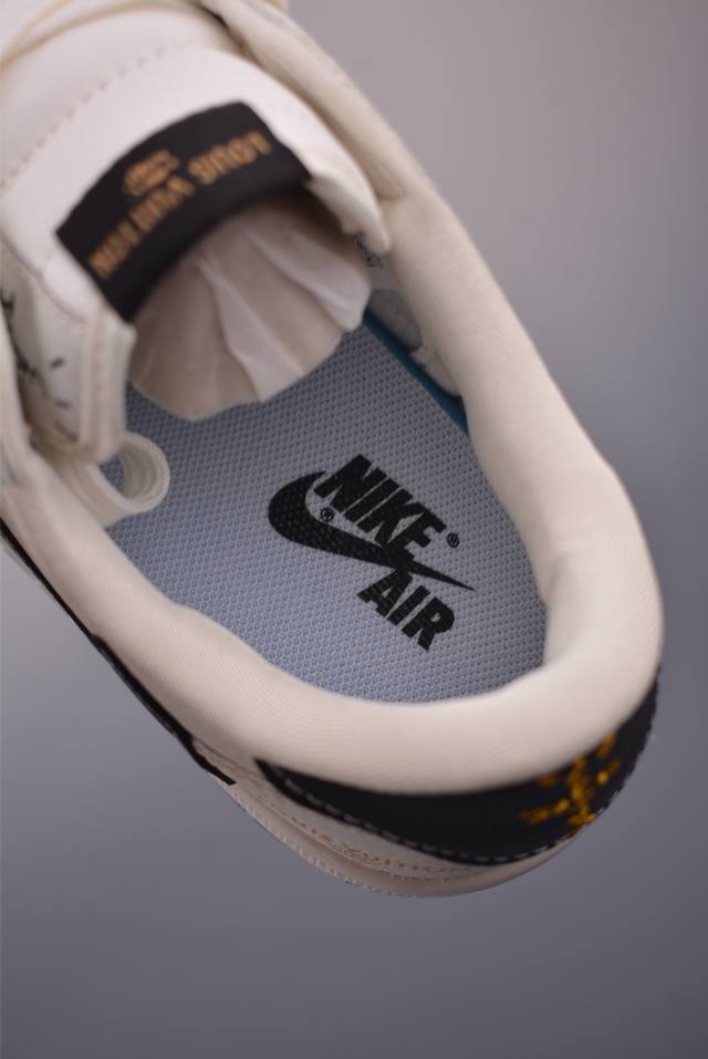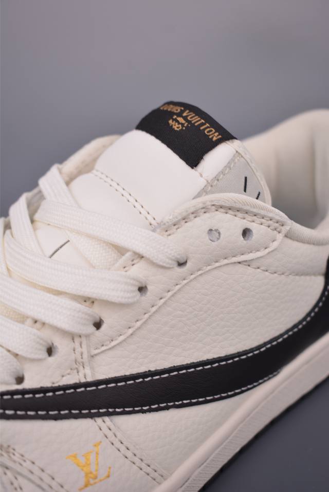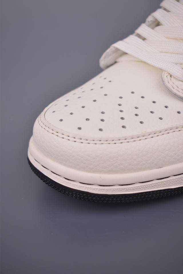 The new three-party collaboration low-top inverted hook upper continues the black toe design. The entire shoe is made of lychee leather, with a white inverted hook on the waist and embellished with Travis Scott's iconic logo. The heel is dominated by Fujiwara Hiroshi's most famous blue color, completing the white, blue and black design style of Fragment Design. The left and right feet are decorated with Travis Scott's ghost face and Jordan's flying wings respectively, highlighting the luxurious style of the three-party collaboration.