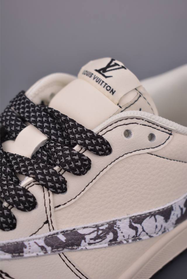 Fragment X Travis Scott X Lv DDD Air Jordan 1 Low Three-Way Collaboration Reverse Swoosh DDD This new three-way collaboration low-top reverse swoosh shoe continues the black toe design. The entire shoe is crafted from pebbled leather, featuring a white reverse swoosh on the midfoot and embellished with Travis Scott's iconic logo. The heel uses Hiroshi Fujiwara's signature blue as the main color, perfecting Fragment Design's signature white, blue, and black design style. The left and right shoes are decorated with Travis Scott's ghost face and Jordan Wings respectively, showcasing the luxurious style of the three-way collaboration. DDD Official Style Code: Xs7089 6162226 DDD Size: 36 36.5 37.5 38 38.5 39 40 40.5 41 42 42.5 43 44 44.5 45 DDD