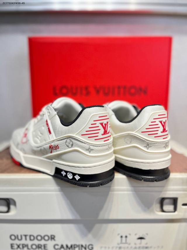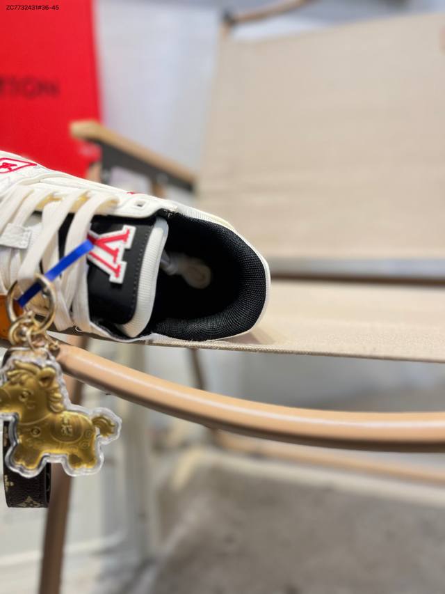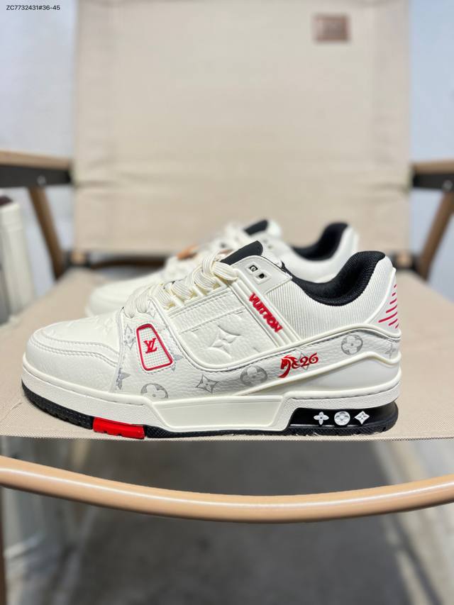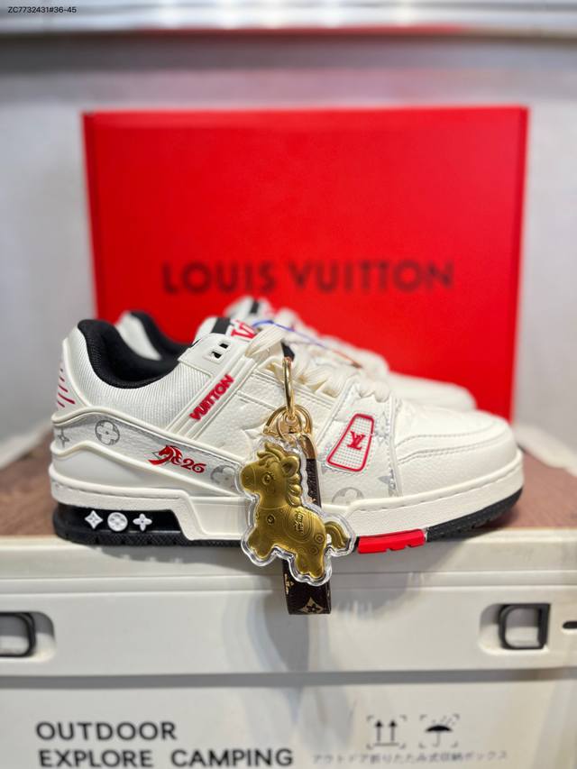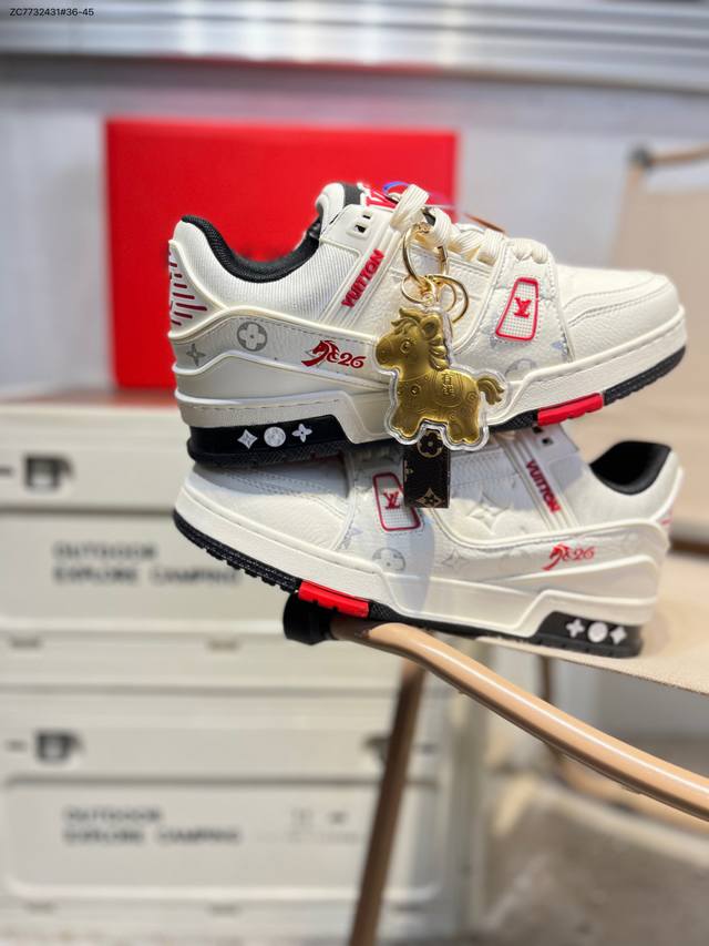 Limited Edition Louis Vuitton (LV) Sneakers for the Year of the Horse. New LV Trainer colorway sneakers, styled like basketball shoes. Designed by Artistic Director Virgil Abloh. Features a microfiber insole and breathable British-style mesh fabric. Zc7732431# 36-45 DDD