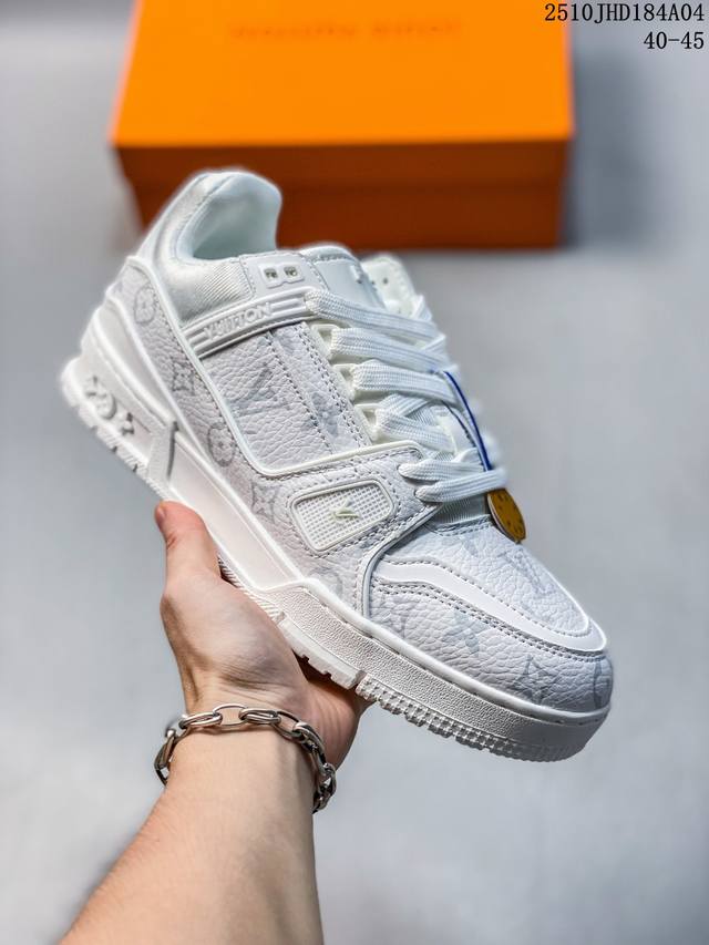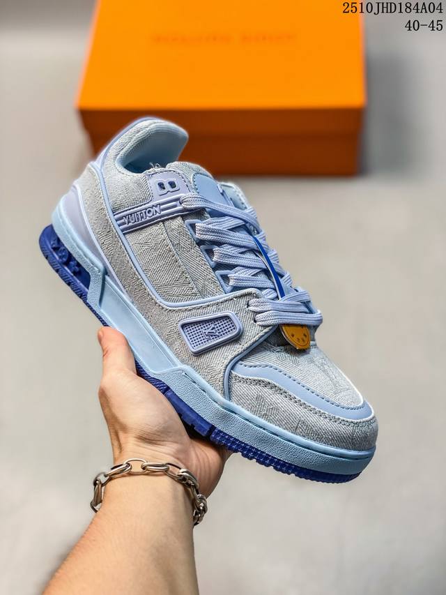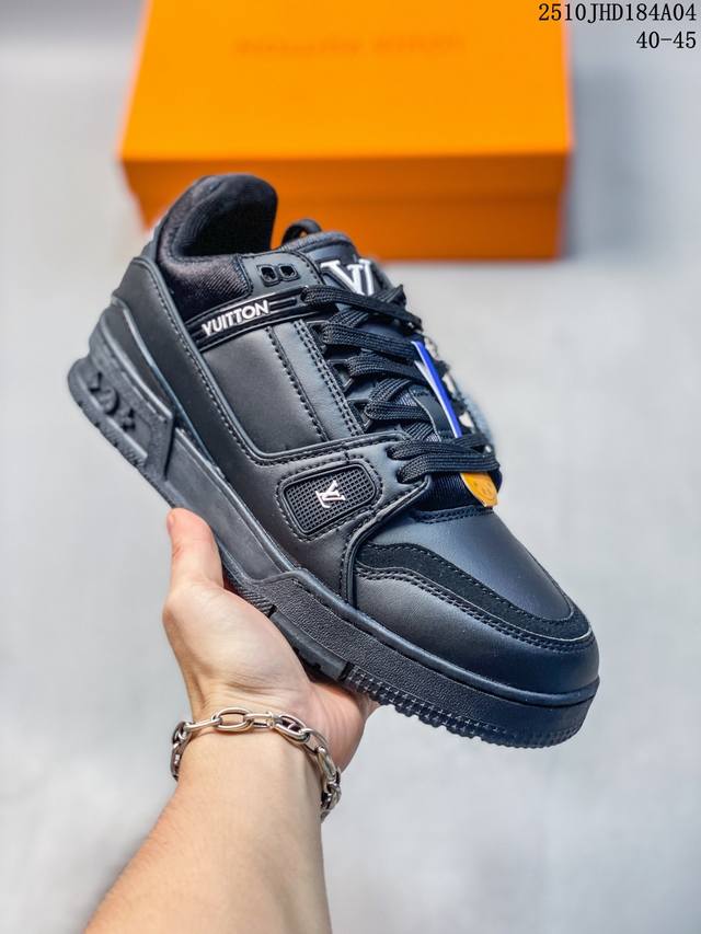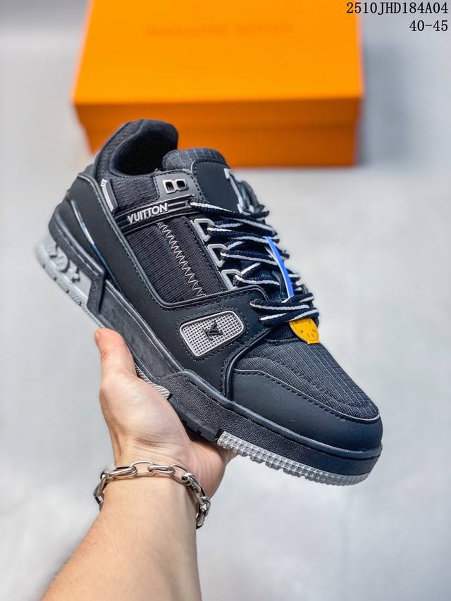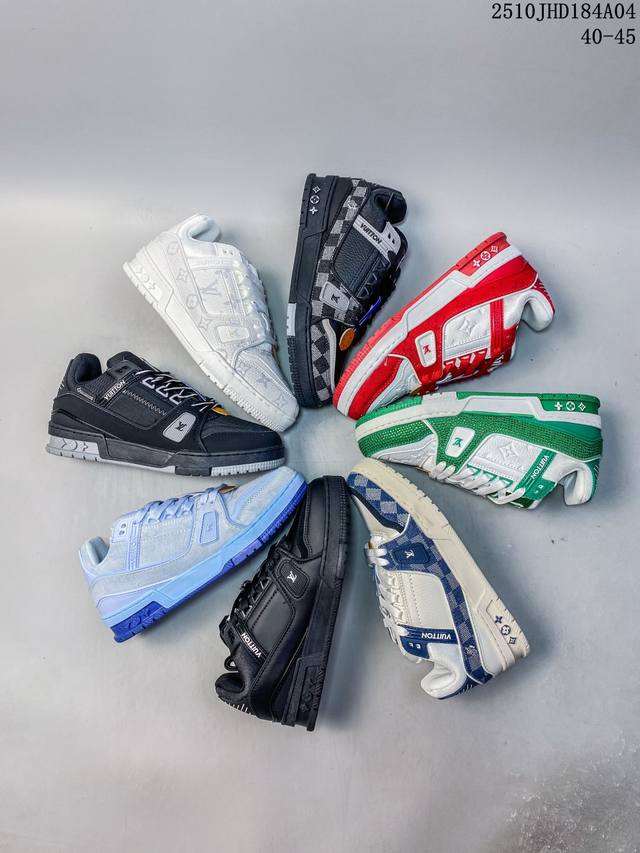 New Lv Trainer latest colorway sneakers Lv brand basketball style sneakers. This shoe is designed by artistic director Virgil Abloh. The insole is made of microfiber and breathable British mesh. Details are consistent with the original. Size: as shown