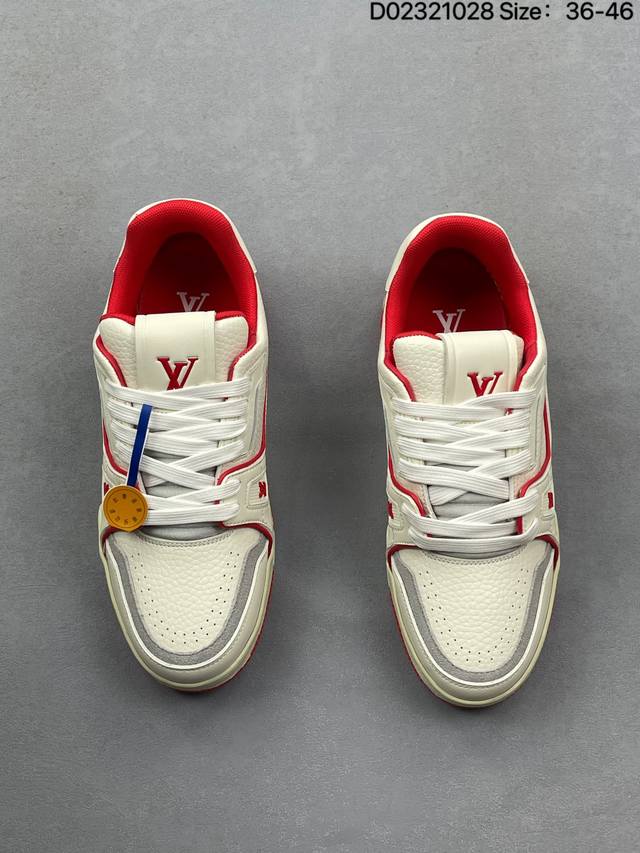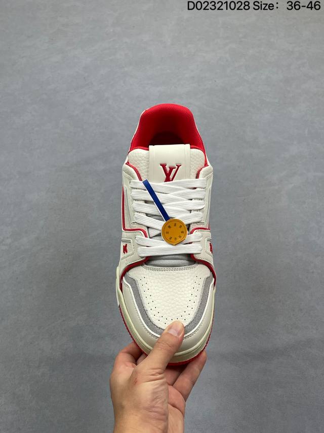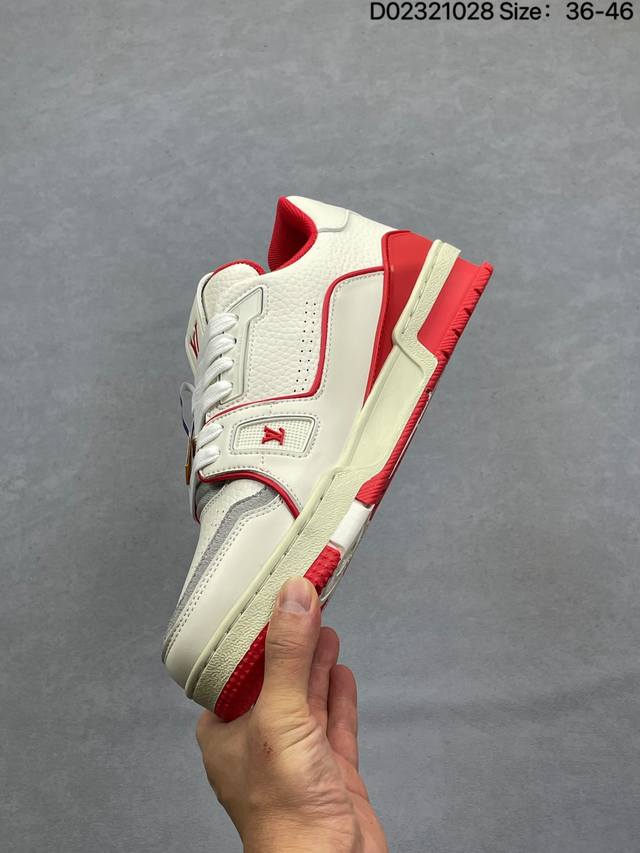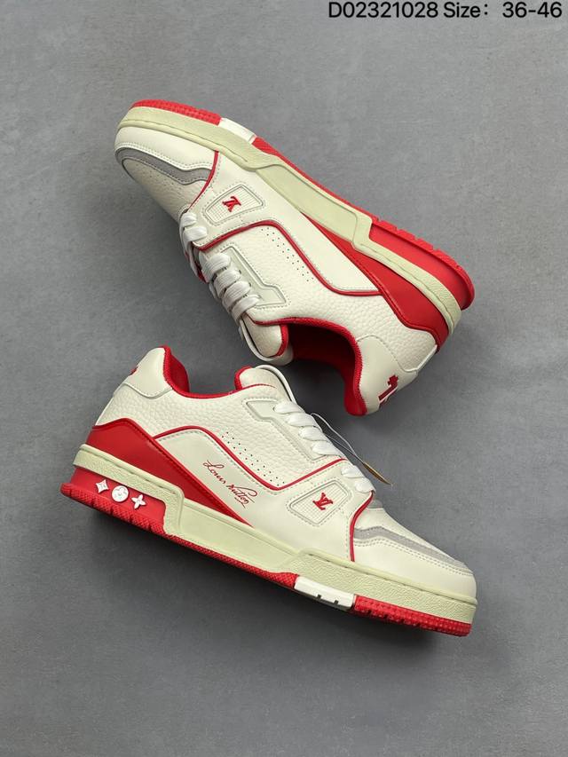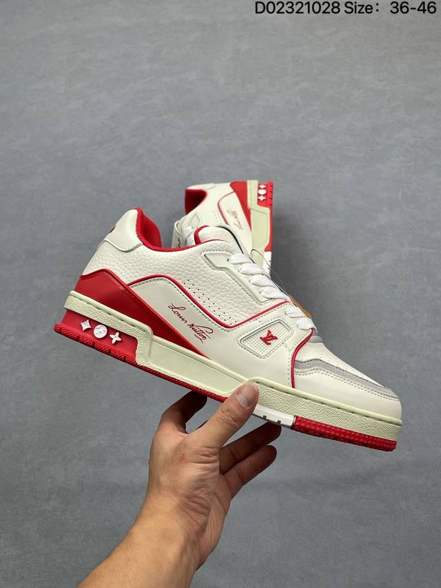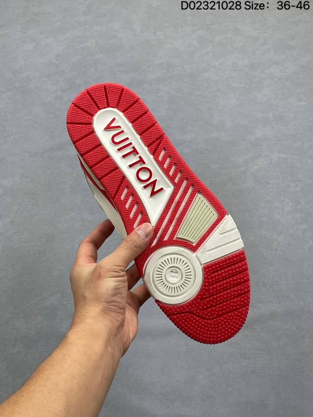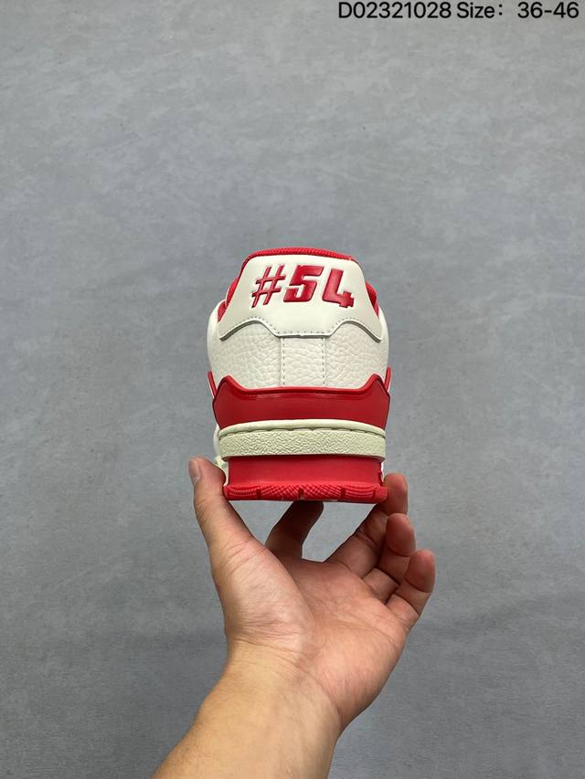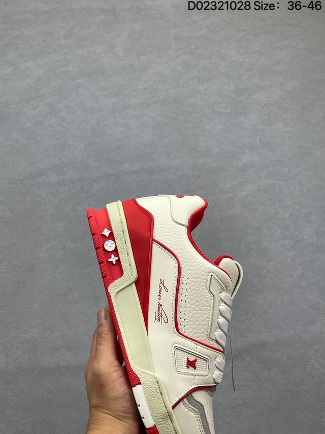 New Lv Trainer latest colorway sneakers Lv brand basketball shoe style sneakers. This shoe is designed by artistic director Virgil Abloh. Insole made of microfiber and breathable British mesh fabric