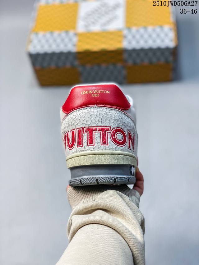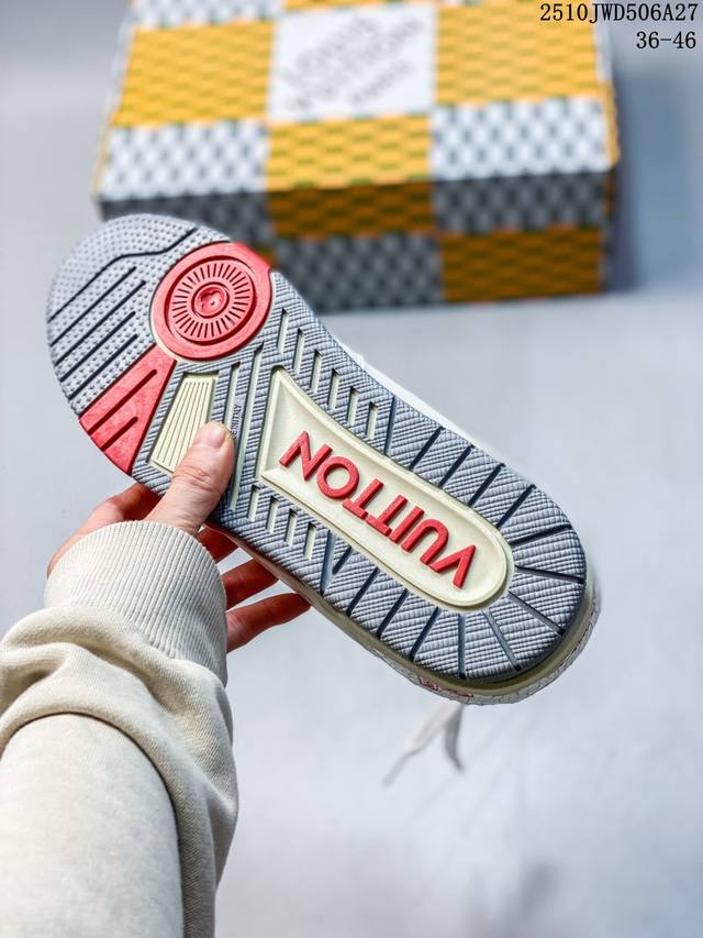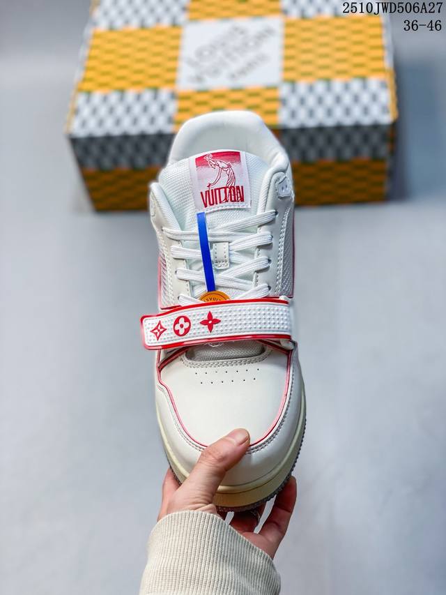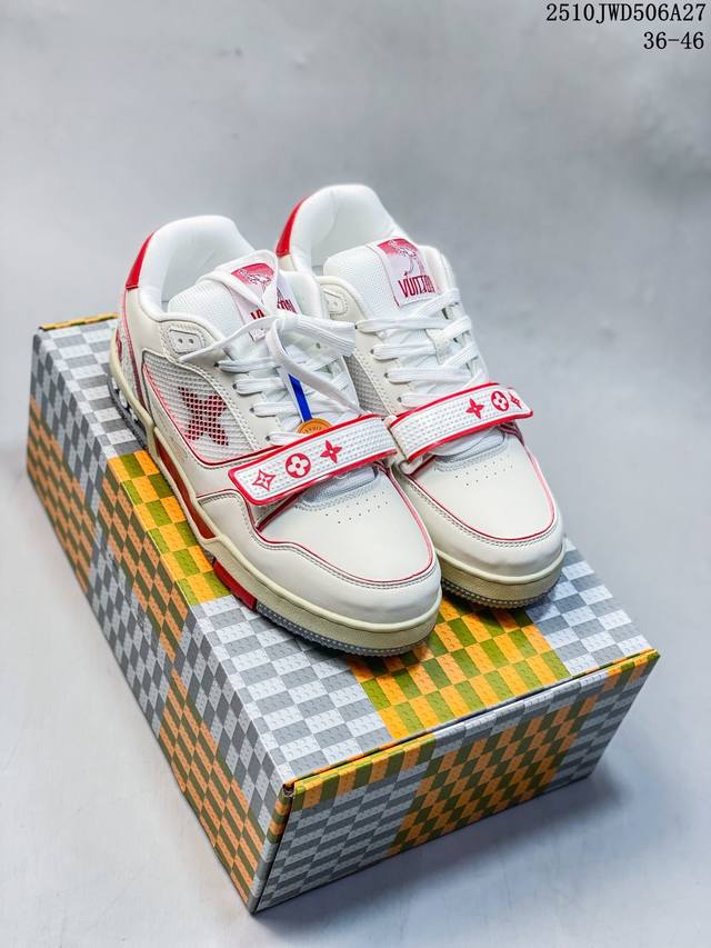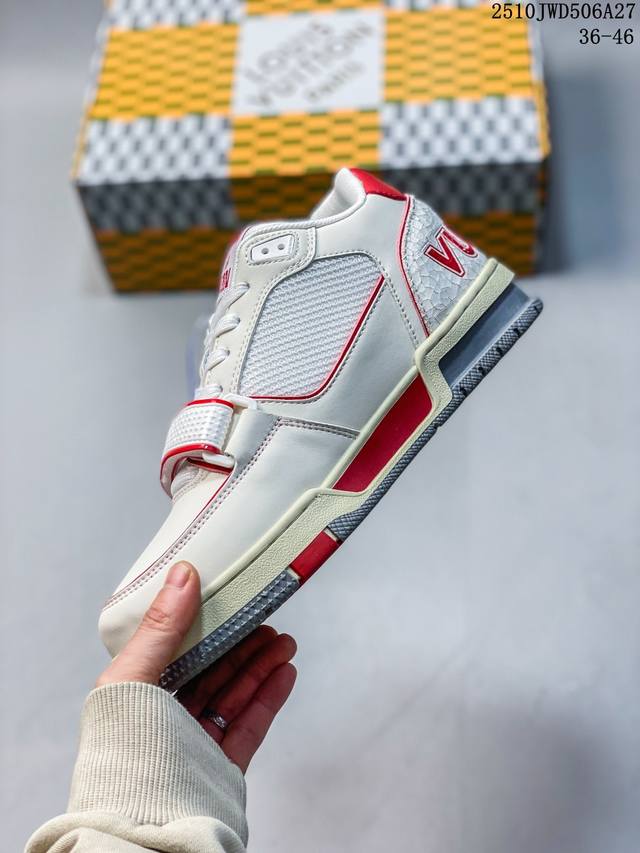 New Lv Trainer latest colorway sneakers Lv brand basketball style sneakers. This shoe is designed by artistic director Virgil Abloh. The insole is made of microfiber and breathable British mesh. Details are consistent with the original. Size: 36-46