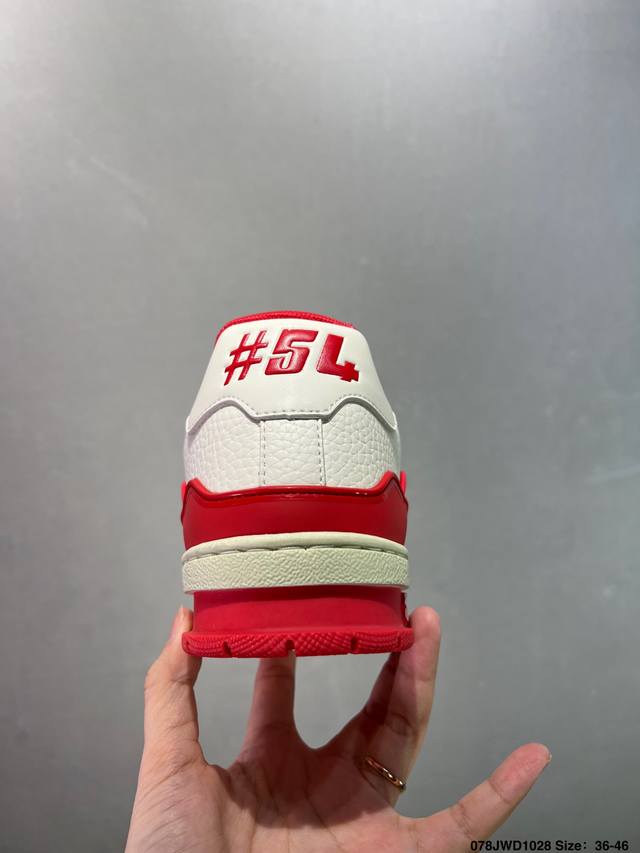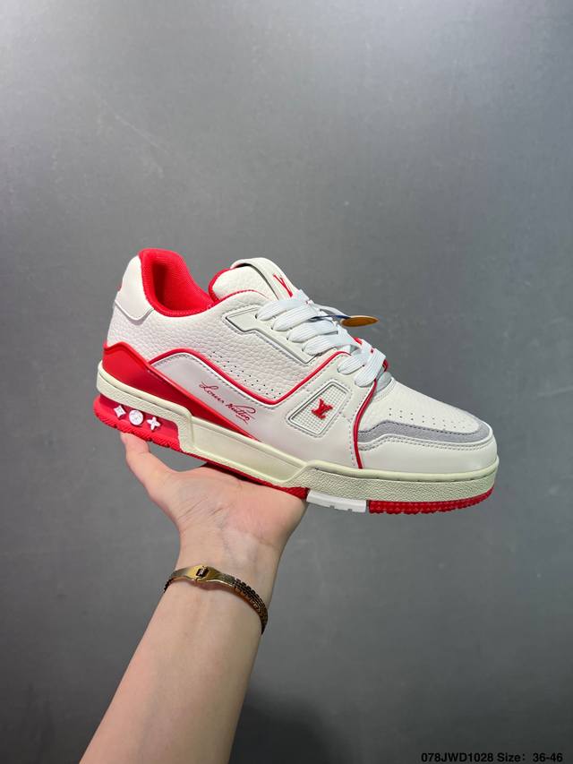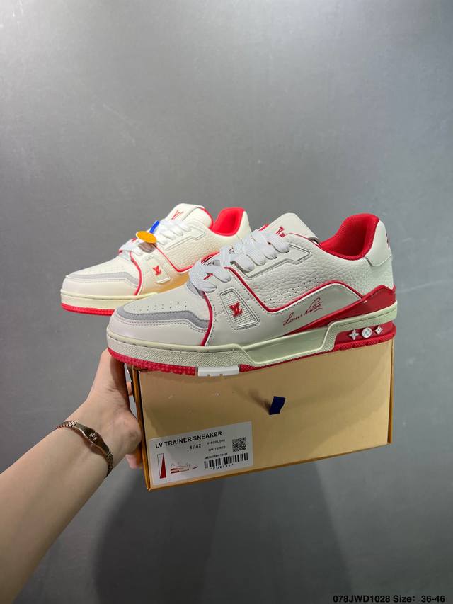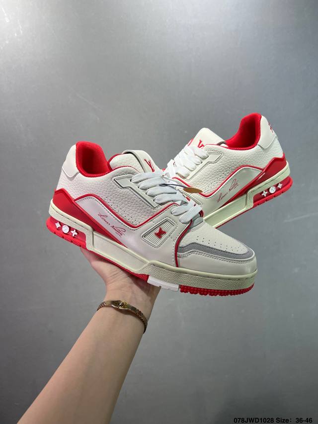 Louis Vuitton Lv Trainer sneakers, latest colorway, basketball style sneakers. Designed by Artistic Director Virgil Abloh, these shoes feature a microfiber insole, breathable British mesh fabric, and details consistent with the original. Size: 36-45 (as pictured). ID: 078Jwd1028