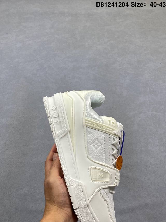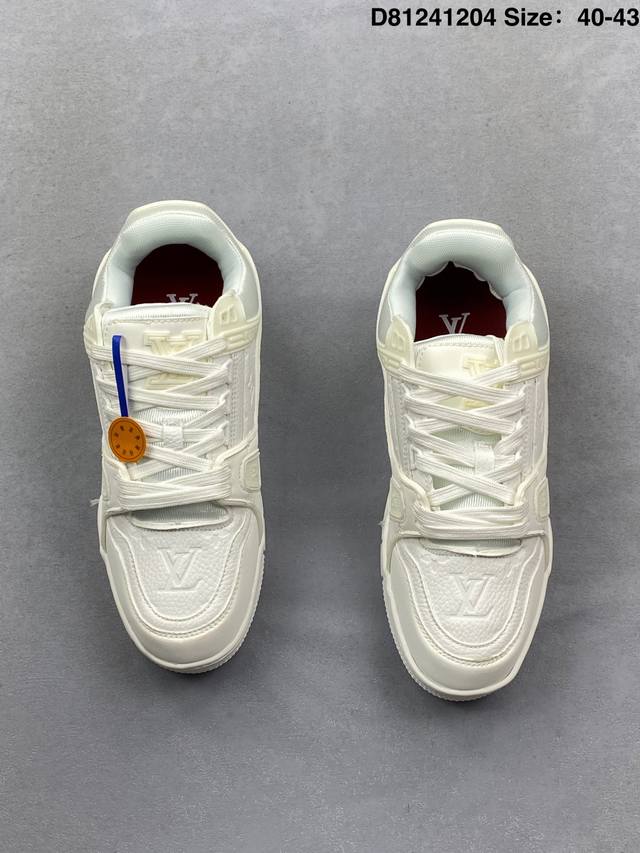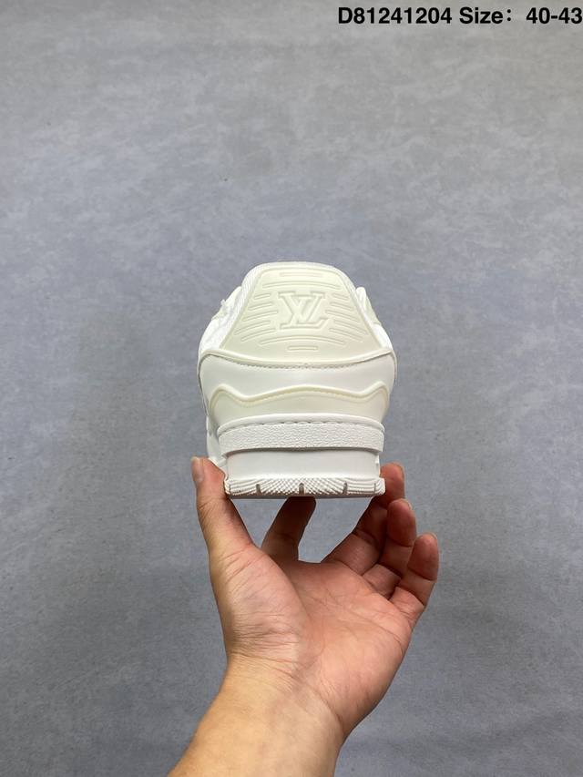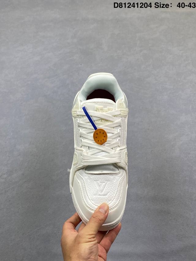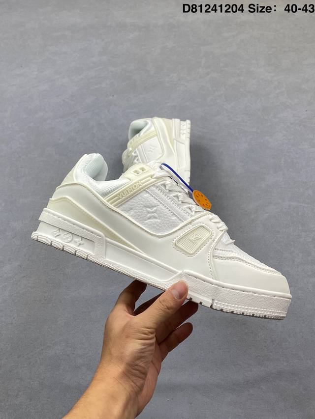 Louis Vuitton Lv Trainer sneakers, new colorway, basketball style sneakers. Designed by Artistic Director Virgil Abloh, these shoes feature a microfiber insole, breathable British mesh fabric, and details consistent with the original. Size: 40-43. (Ddd D81241204 DDD)
