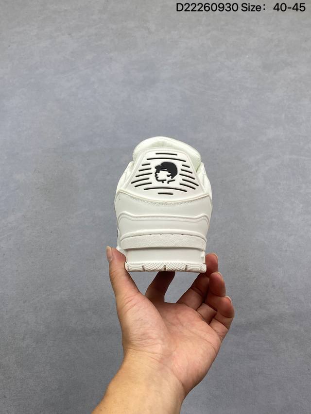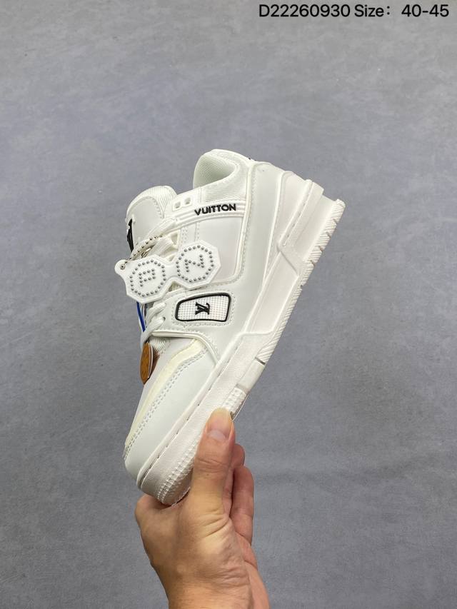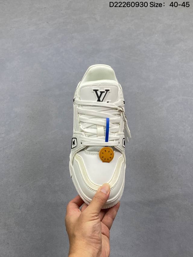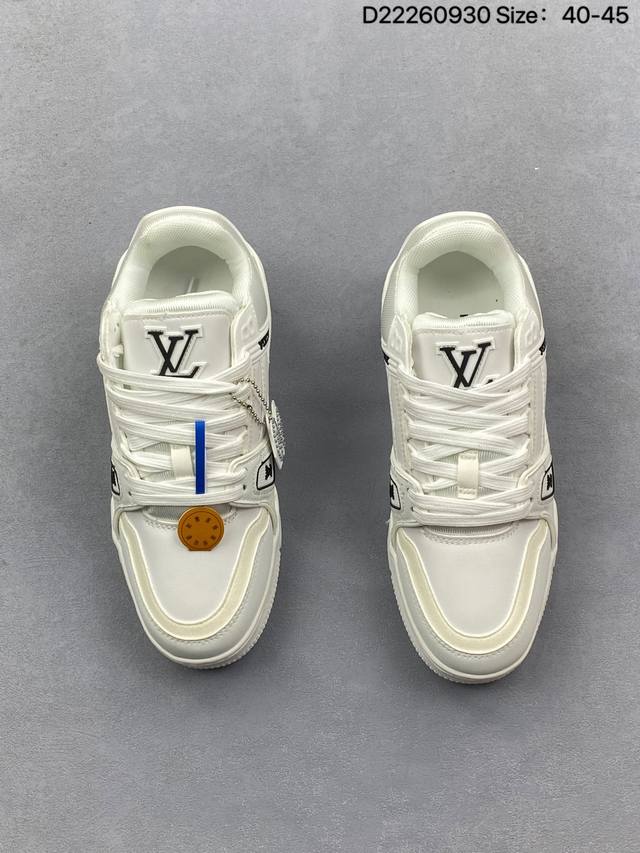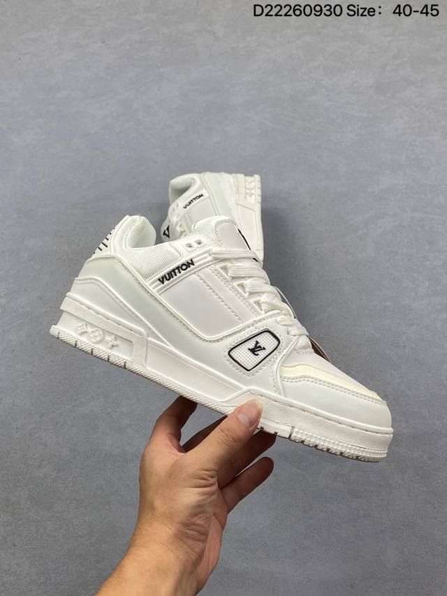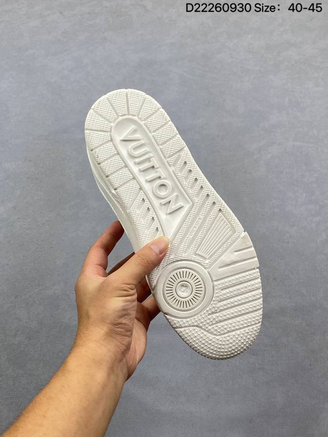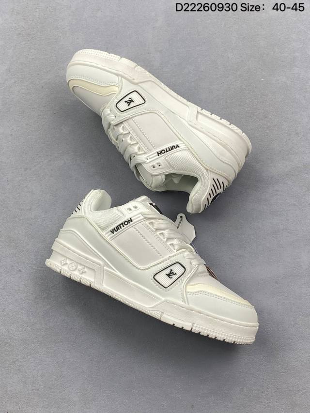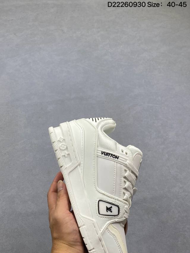 Louis Vuitton men's and women's shoes come in a sturdy drawer gift box. Made with a lychee-grained fiber leather and grained cowhide split leather upper, the insole features soft-feeling EVA material and an external TPR glossy, color-blocked sole. This Louis Vuitton Trainer Sneaker Low is a low-top, retro, versatile, casual, athletic, and cultural basketball sneaker from the century-old French Parisian luxury brand. Type: Men's and Women's Shoes. Size: As shown. Code: D22260930.