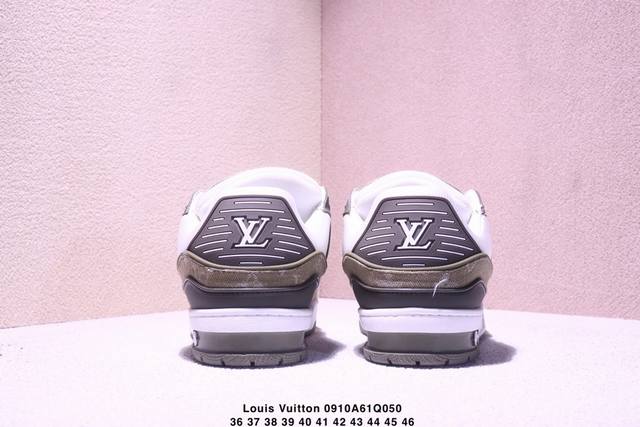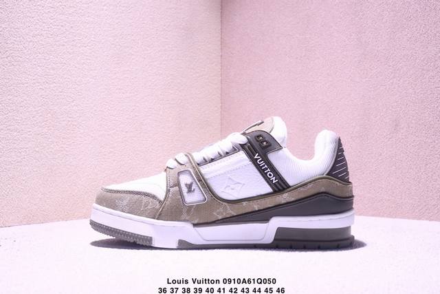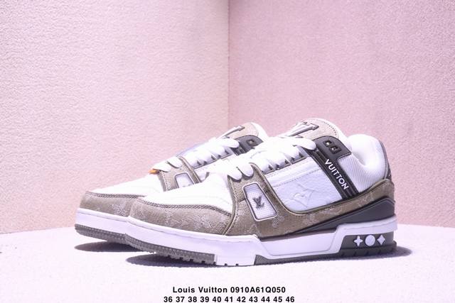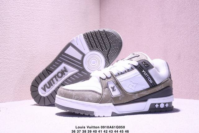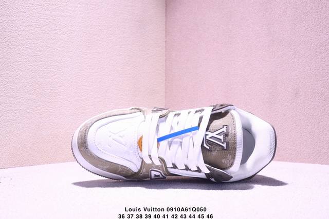 Louis Vuitton men's and women's shoes, made with a lychee-grained fiber leather and grained cowhide split leather upper, an insole inlaid with soft-feeling EVA material, and an external TPR glossy, color-blocked sole. This Louis Vuitton Trainer Sneaker Low is a low-top, retro, versatile, casual, and athletic basketball sneaker from the century-old French luxury brand, Louis Vuitton, Paris. "