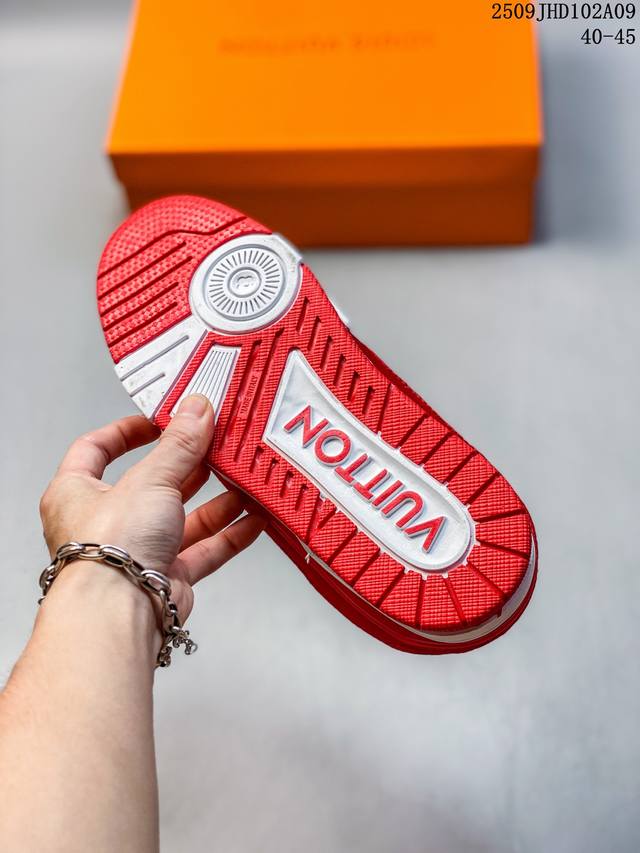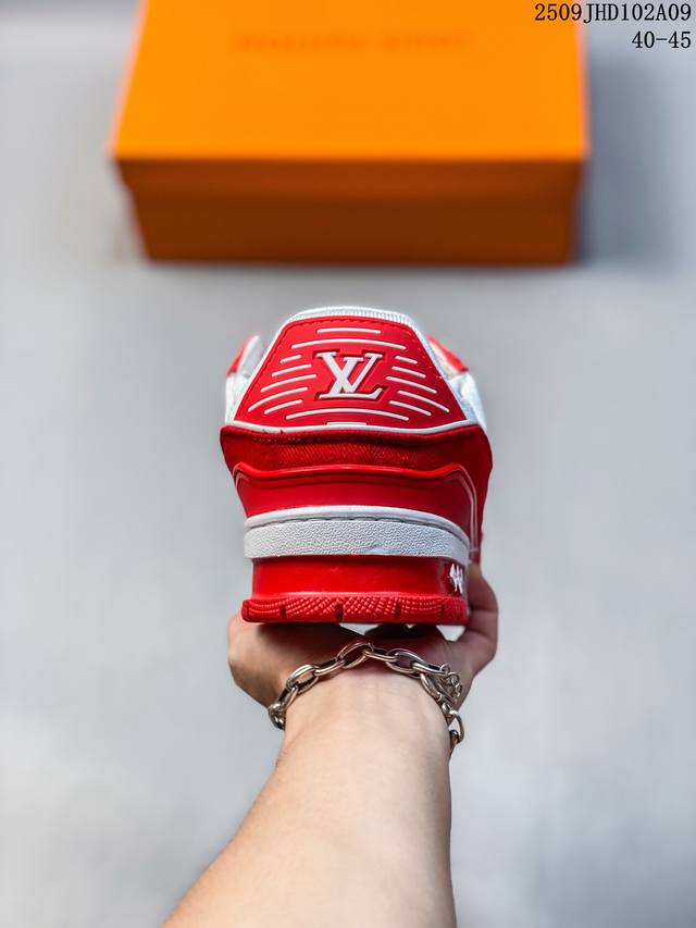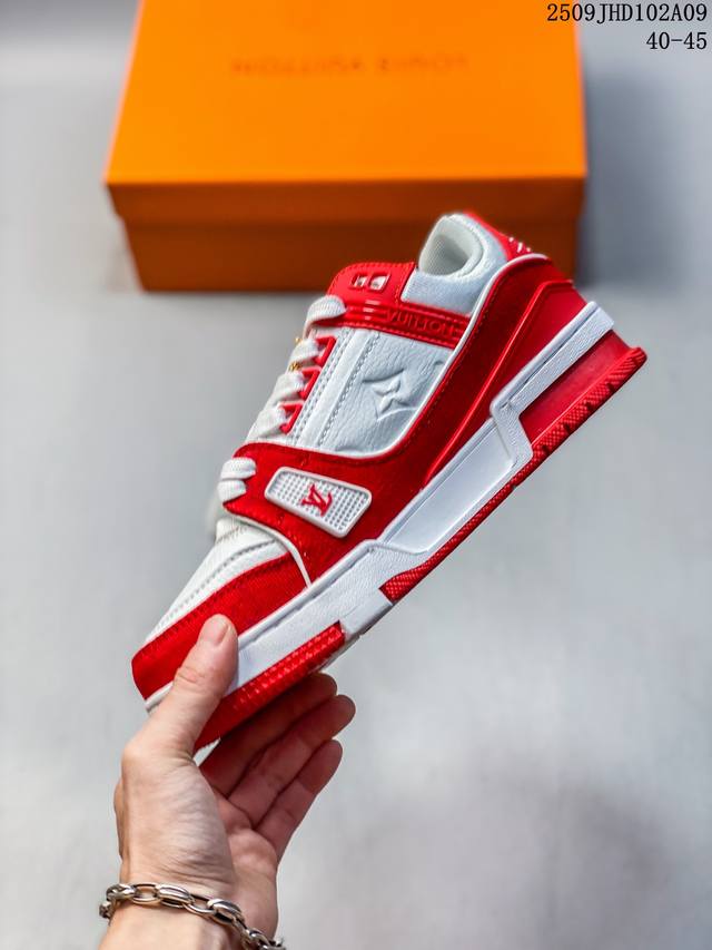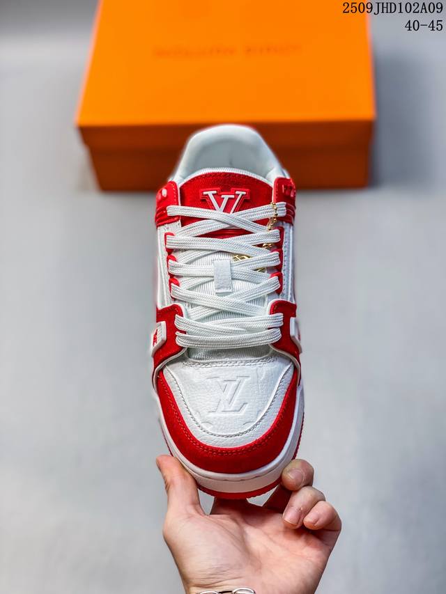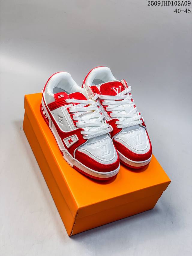Louis Vuitton men's shoes, made of lychee-grained split-leather and grained split-leather uppers, insoles embedded with soft-feeling EVA material, and external TPR glossy color-blocking soles. Louis Vuitton Trainer Sneaker Low, a low-top, retro, versatile, casual, sportswear basketball sneaker from the century-old French Parisian luxury brand. Size: See picture. Code: 09Jhd102A09.