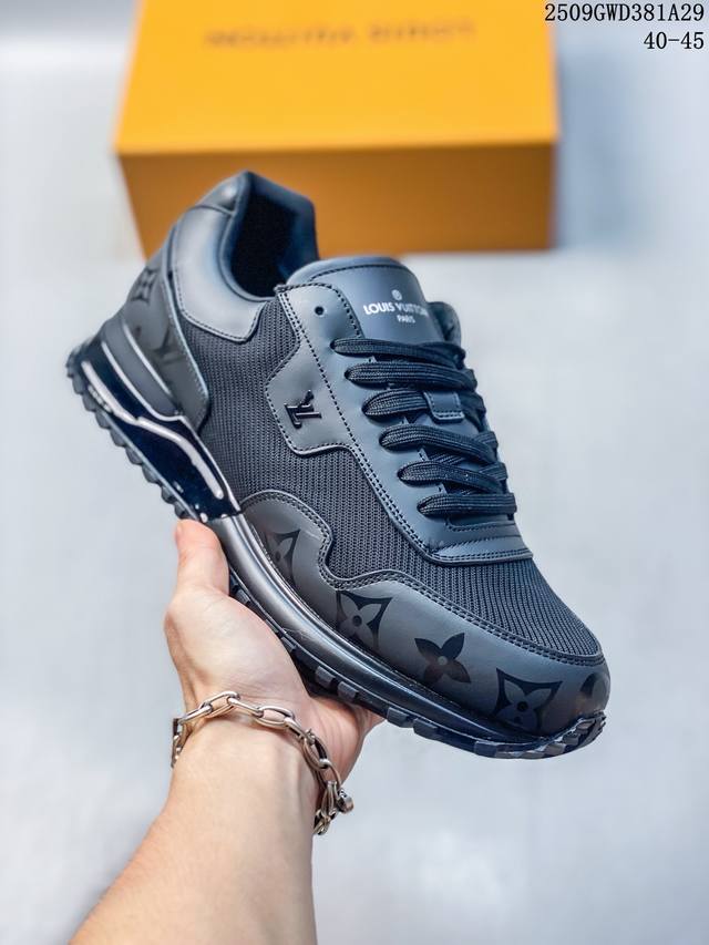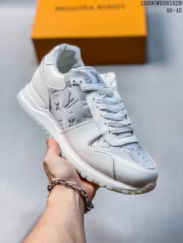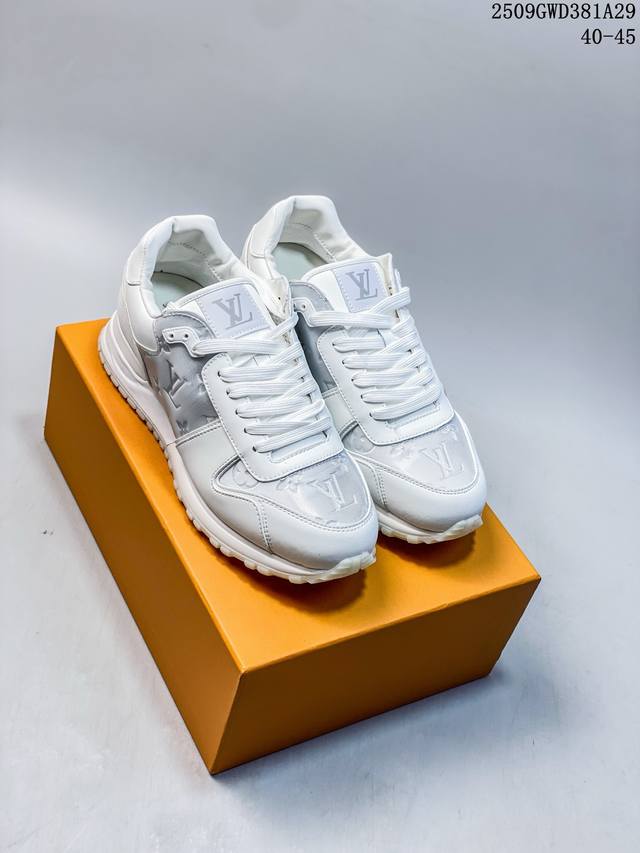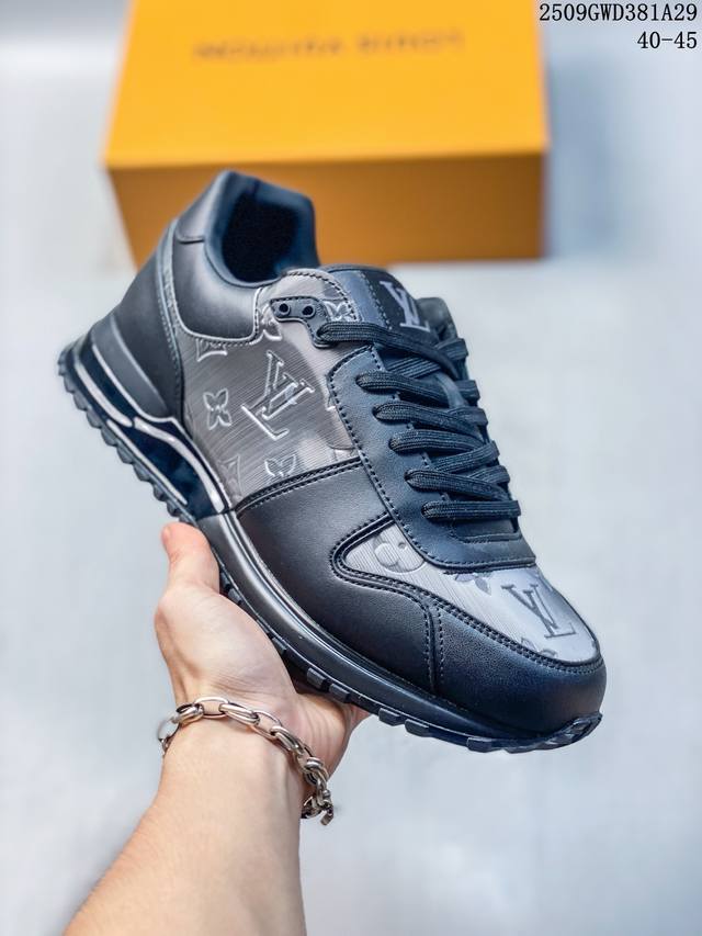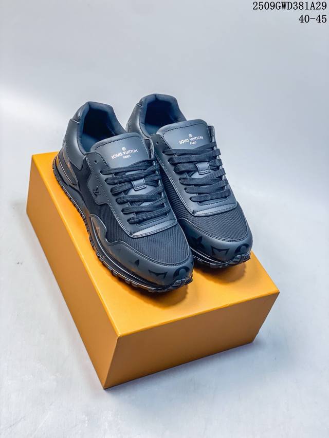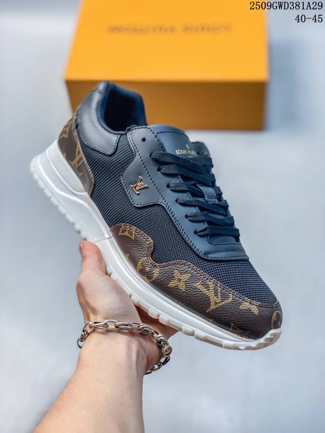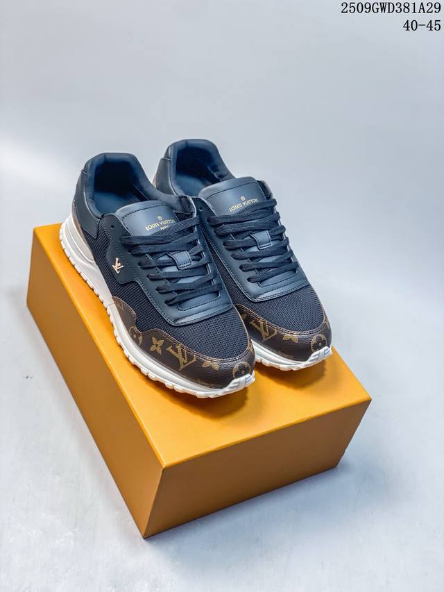 Louis Vuitton Run Away Men's Round Toe Lace-up Casual Low-top Sneakers in Calfskin Leather. High-quality export order. Each colorway is custom-made to match the original, ensuring perfect color matching. The outsole is made with high-elasticity, environmentally friendly foam, with mold costs reaching tens of thousands of yuan. The entire shoe is made of genuine leather, completely different from the microfiber quality found elsewhere on the market. The actual product has a better feel and texture. Made in Dongguan, this is a pure original quality upgrade. Comes with original accessories, gift box, and full set of original packaging. #Uses top-grain calfskin leather trim, mesh fabric upper, ultra-soft leather lining, and insole. #Independently developed TPU rebound midsole. #Combined with TPR wear-resistant outsole. Sizes: 40 41 42 43 44 45. 09Gwd381A29