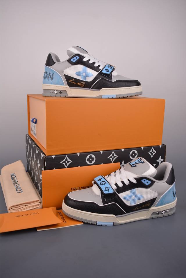 Louis Vuitton Trainer Velcro Shoes. Made in Dongguan with a perfect last, this pair boasts superior quality control compared to 95% of other shoes on the market. Features a TPU outsole, an exclusive sole development costing over 50,000 RMB, and a texture comparable to the original. The high density of the sole distinguishes it from competitors in terms of color and texture. Made with imported Italian top-grain calfskin, its thickness and toughness surpass other brands. Includes original insole material, breathable British mesh, and is crafted to a 1:1 replica of the authentic product. No corners are cut or adulterated. Details are identical to the original. Full set of original packaging and accessories. Currently a top-tier product on the market. Please note that the market is chaotic; versions are often mixed. Materials, fit, texture, exclusive packaging and accessories