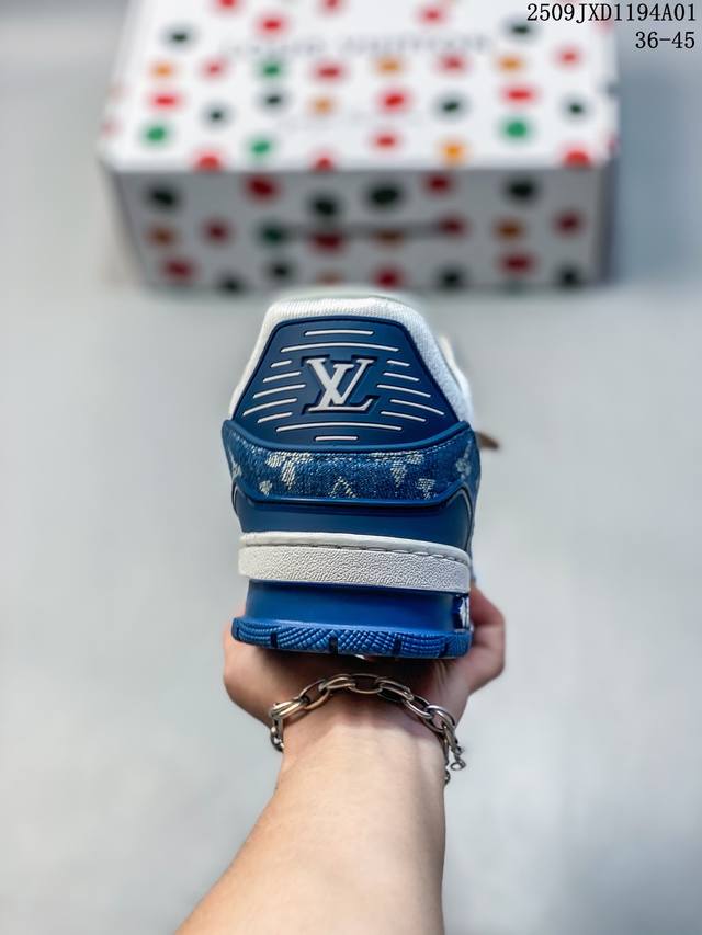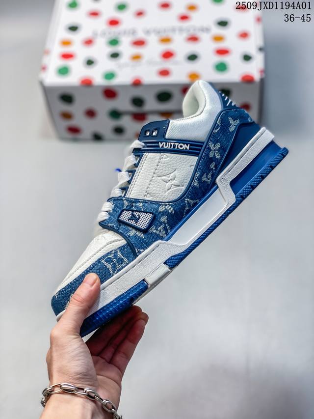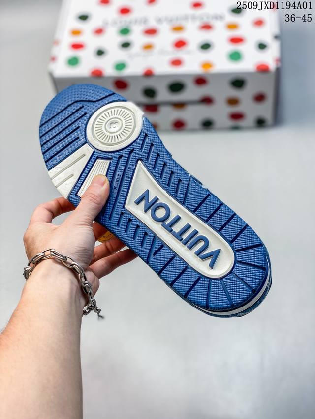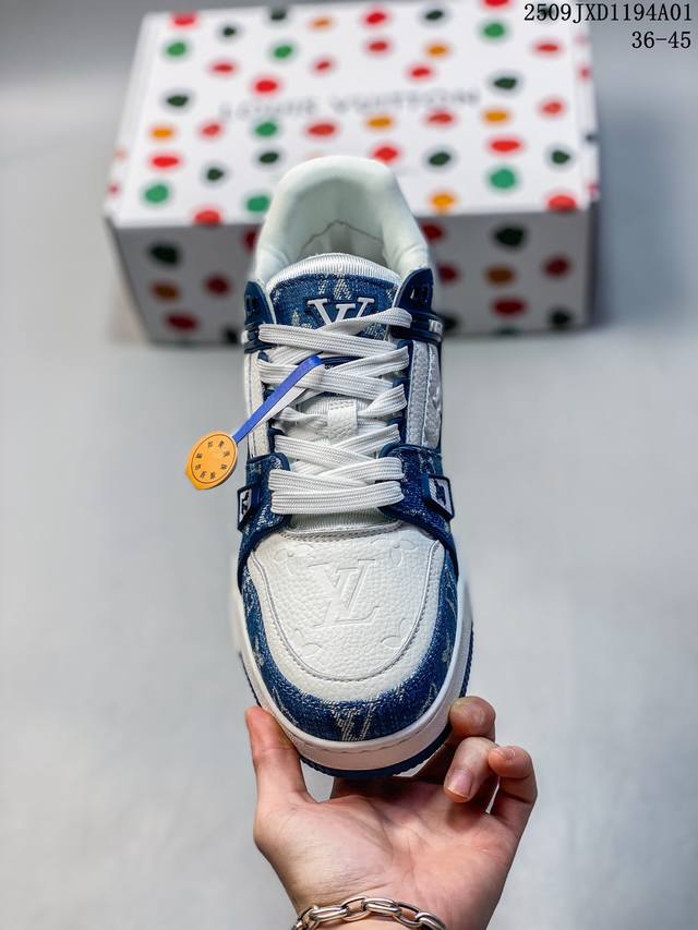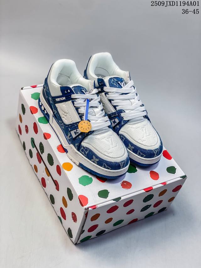 Lv Trainer sneakers, these Lv Trainer sneakers are made of grained cowhide leather with colorful tones, with decorative embellishments on the upper and a handwritten Louis Vuitton logo on the side, which complements the western-style Vuitton logo on the back. The original design was created by Virgil Abloh and is inspired by retro basketball shoes. Continuing the complex upper, the injected rubber outsole continues the iconic elements, with Lv lettering on the tongue and side, a Vuitton logo on the back, a Monogram flower on the outsole, and a handwritten Louis Vuitton logo on the side. The standard insole provides a comfortable experience. Comes with original box and full packaging!