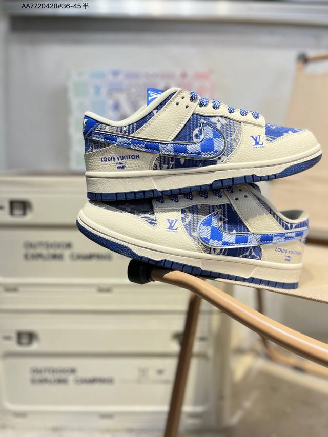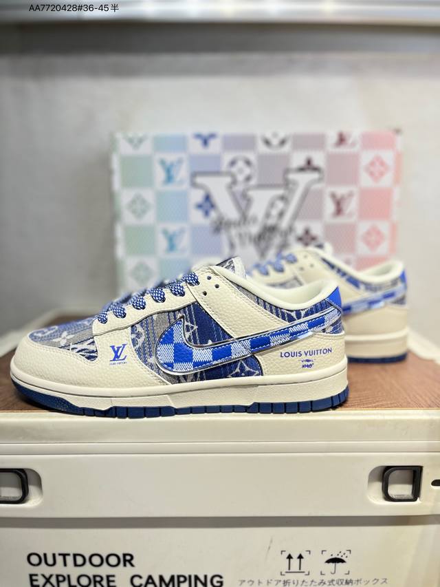 Lv X Nike SB Dunk Low. Highly recommended new colorway from a major manufacturer. Made with original top-grain materials and a unique design using steam distillation. Offers a superior visual and tactile experience. High-quality factory-direct shipping. Cleanliness guaranteed. Electrically embroidered leather with clean cuts and no rough edges. Perfect details. DS6608 Aa7720428# 36-45.5.