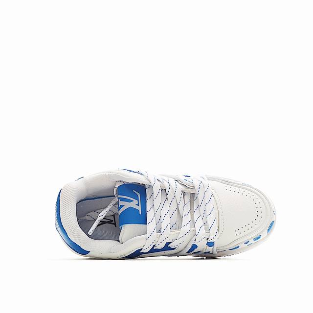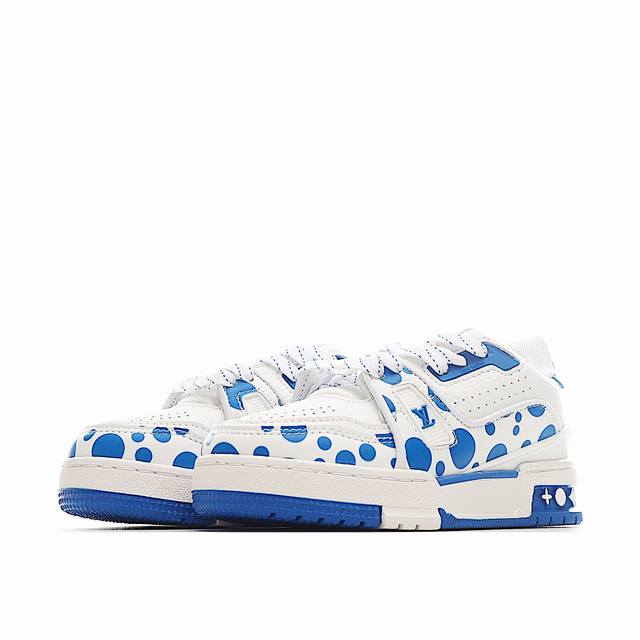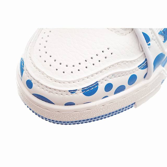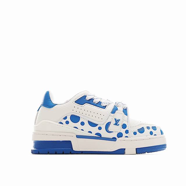 Lv Casual Fashion Children's Sneakers DDD LT sneakers are from the LV collaboration series. The shoes feature an infinite polka dot pattern inspired by avant-garde artists on the cowhide leather surface, creatively upgrading a classic VA shoe. The collaboration series logo is marked on the heel. DDD Sizes: 26-37 DDD Style Code: White/Blue DDD