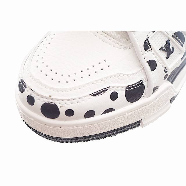 Lv Casual Fashion Kids Sneakers DDD LT sneakers are from the LV collaboration series. The shoes feature an infinite polka dot pattern inspired by avant-garde artists on the cowhide leather surface, creatively upgrading a classic VA shoe. The collaboration series logo is marked on the heel. DDD Sizes: 26-37 DDD Style Code: White/Black DDD