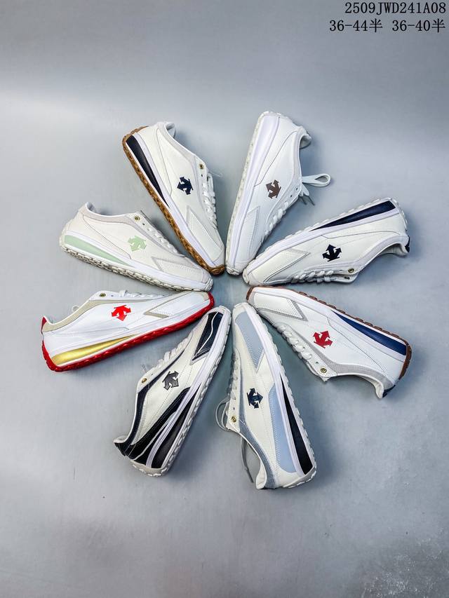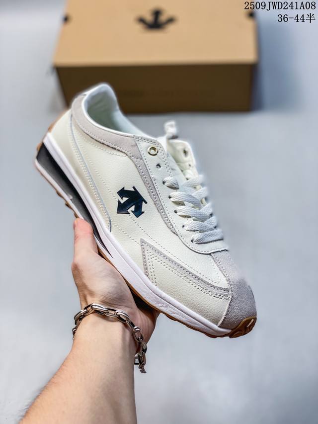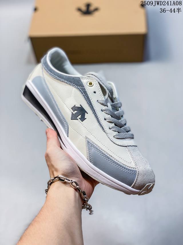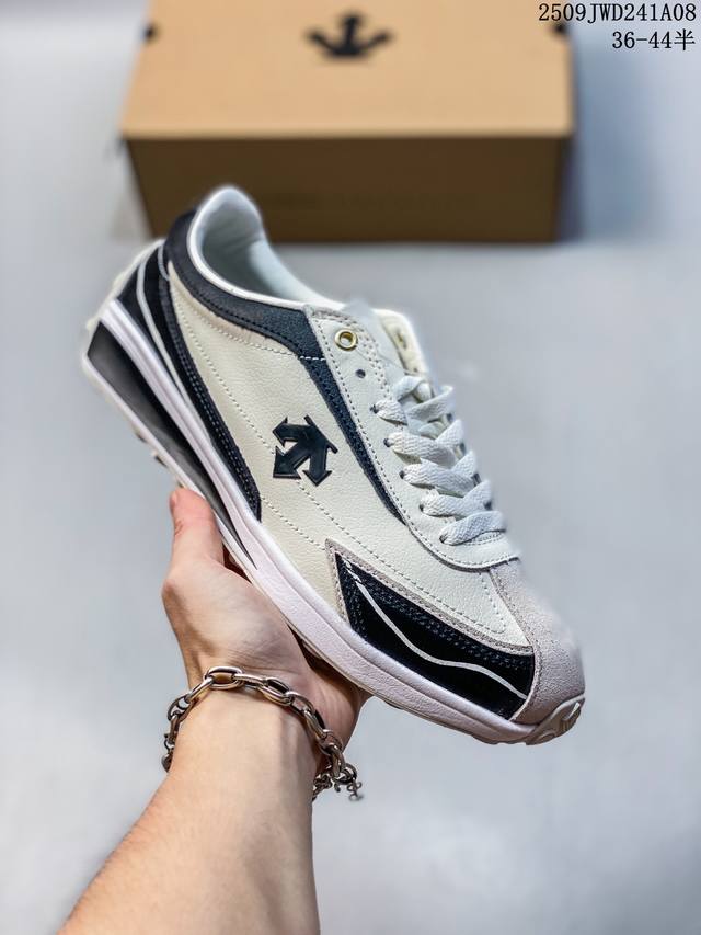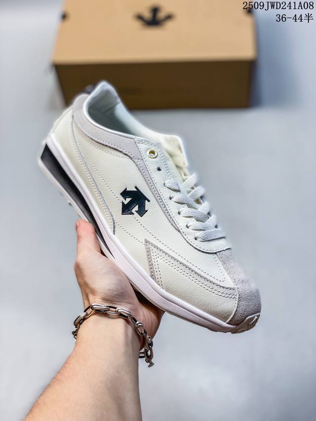 Men's and Women's Shoes, Authentic Half-Size, Developed from the Original Last and Original Paper Version, Made of Transferred Cowhide Leather with Suede Overlays for the Upper, Meticulously Pulled Midsole, External Lightweight Md Foam Rubber with Non-Slip, Wear-Resistant Rubber Outsole. Japanese Professional Sports Brand - Descente Sport Style Chron Racer Time Rhythm Racing Series Retro Classic All-Match Casual Sports Jogging Shoes "Leather Beige Black Raw Rubber Outsole S Lcr188
