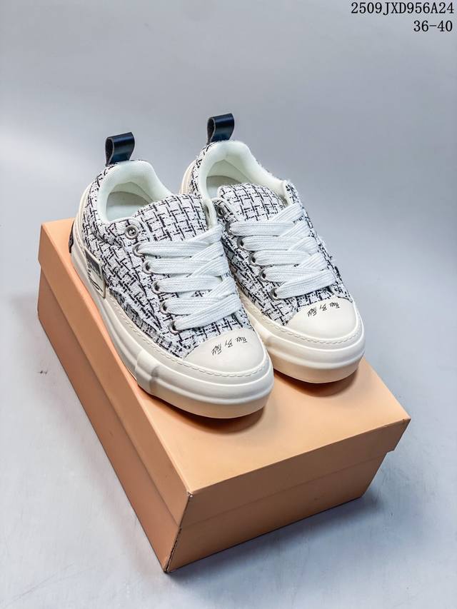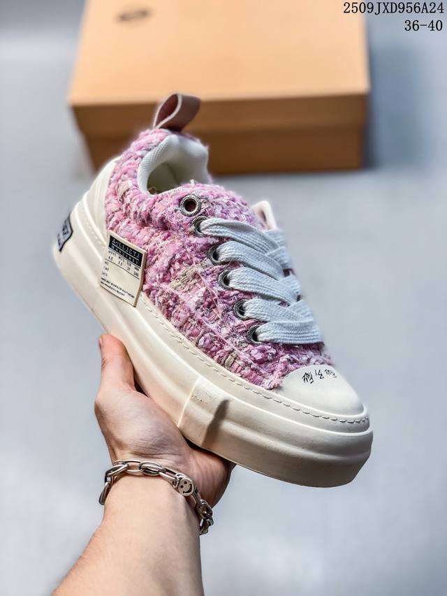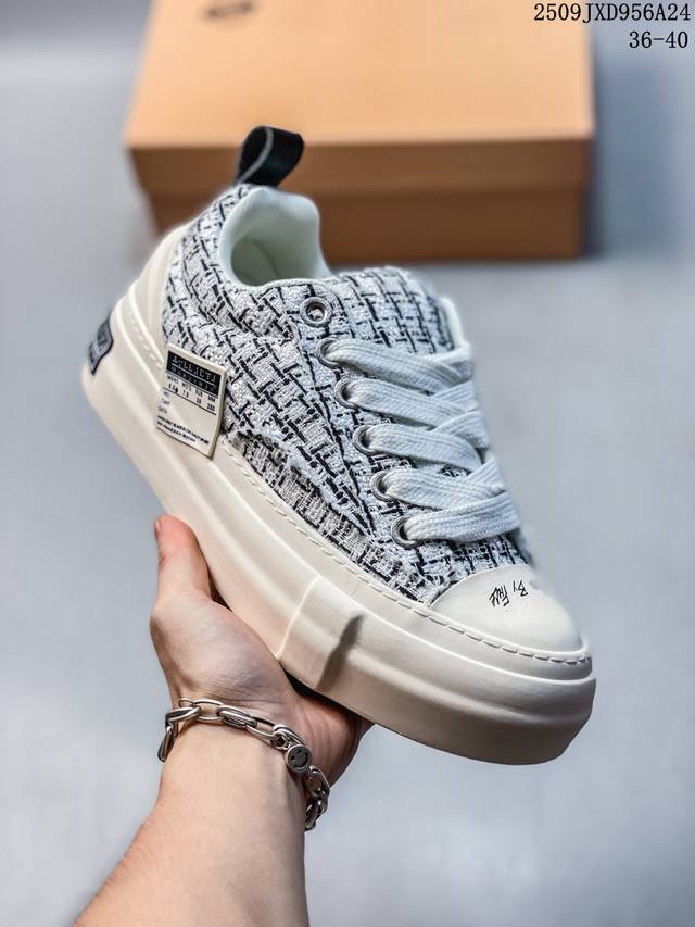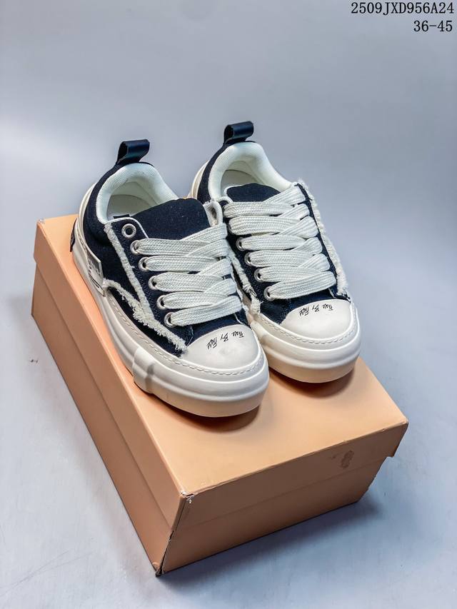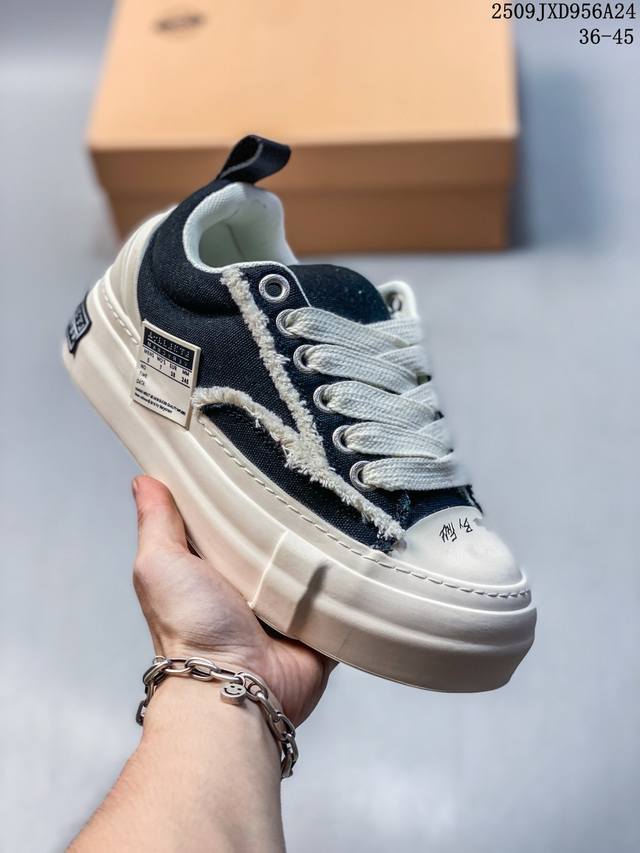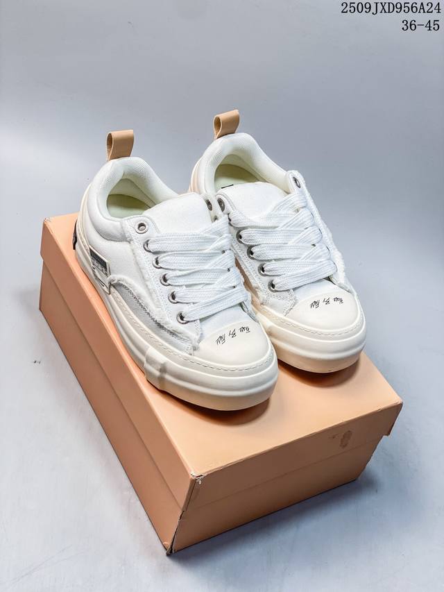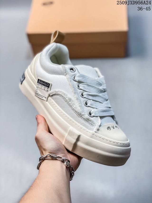 Xvessel low-top apricot canvas platform shoes, the same style as Vanness Wu. Unisex style, classic distressed, raw edges, seamless, comfortable, low-top casual canvas shoes with added height. Xvessel is a brand that blends deconstructionism with iconic design elements. Since the launch of its signature cork-vulcanized canvas shoes in 2017, the brand has been incorporating trendy design elements into deconstructionism to create trendy pieces with a unique perspective. The overall design language of the Xvessel platform shoes is similar to the classic style, differing in that the outsole has an additional layer, eliminating the leaky cork insole, creating a more integrated feel. The canvas upper features a classic, high-definition handwritten print. The doubled-tag design is a new design with layered black and white deconstructed elements. A unique touch, echoing the shoe's name, is the replacement of the classic outer label with a doubled-tag design.