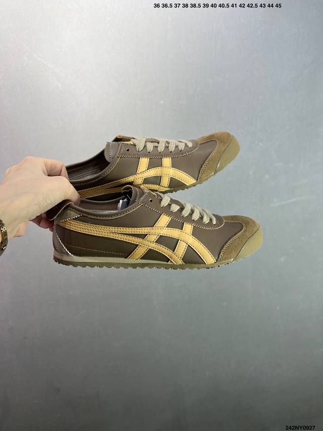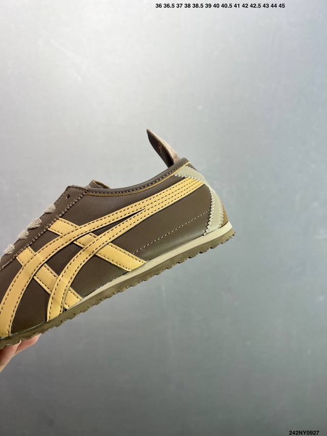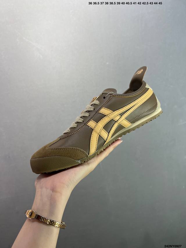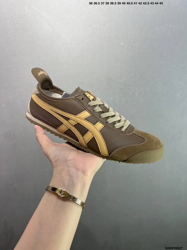Asics men's and women's shoes, genuine half-size, made in Japan, a classic and established brand - Onitsuka Tiger Mexico 66. Classic Mexican series, retro and versatile sneakers, casual sports shoes, and jogging shoes. Made with a soft cowhide upper, the shoes feature a rubber content exceeding national standards and a wear-resistant and bend-resistant RB outsole. The styles, colors, and shapes of these products embody the pursuit of comfort and perfection in detail. Footwear emphasizes the rigor of handcrafting, with a design style that blends comfort and wearability. Focusing on perfect details and a unique charm, they maintain a sense of stability while also maintaining a relaxed sense of fashion. Sizes: 36-44, including half sizes. Item No.: 242Ny0927.