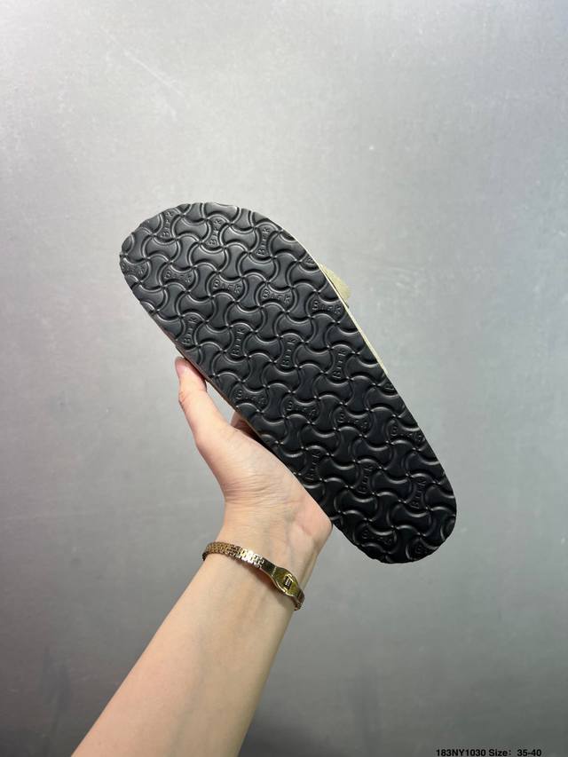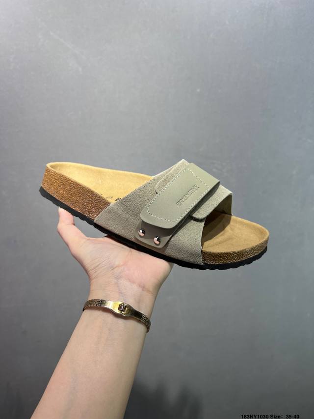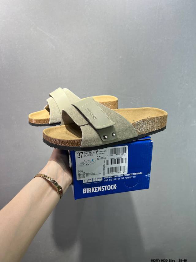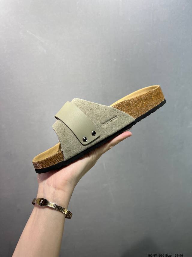 Birkenstock, a century-old German footwear brand, presents closed-toe slippers from the Birkenstock series, made in Guangdong. Features a soft cowhide leather midsole with cushioned cork rubber, and a lightweight EVA outsole. Size: As pictured. Code: 183Ny1030