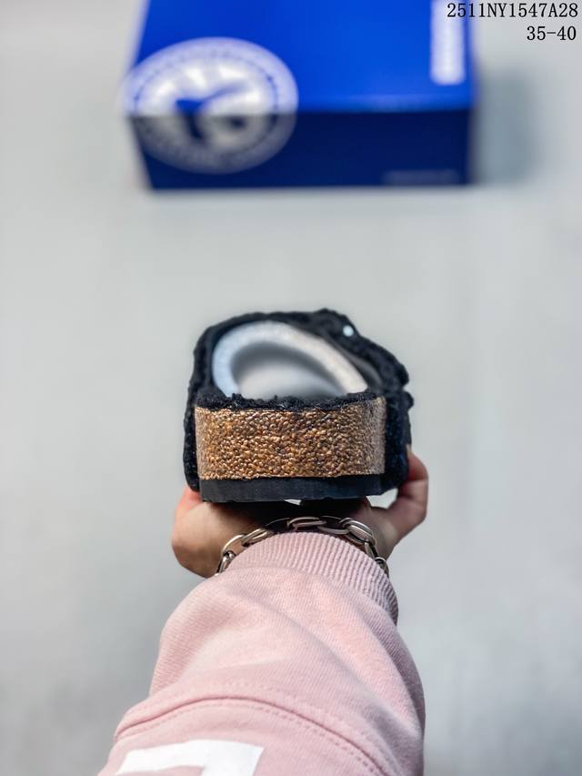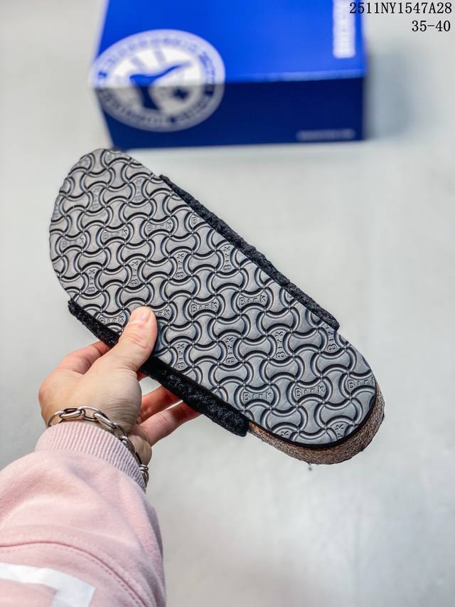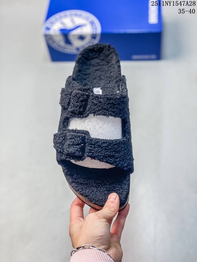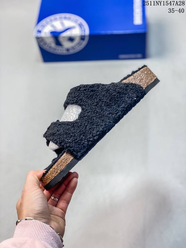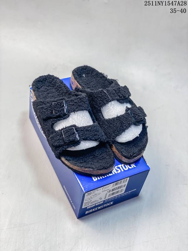 Birkenstock, a century-old German footwear brand, presents its new Autumn/Winter collection of Birkenstock slippers with cotton and fleece lining. Made in Guangdong. Features soft cowhide leather, cushioned cork rubber midsole, and a lightweight EVA outsole. Runs one size large. Sizes: 35-40. (11Ny1547A28)