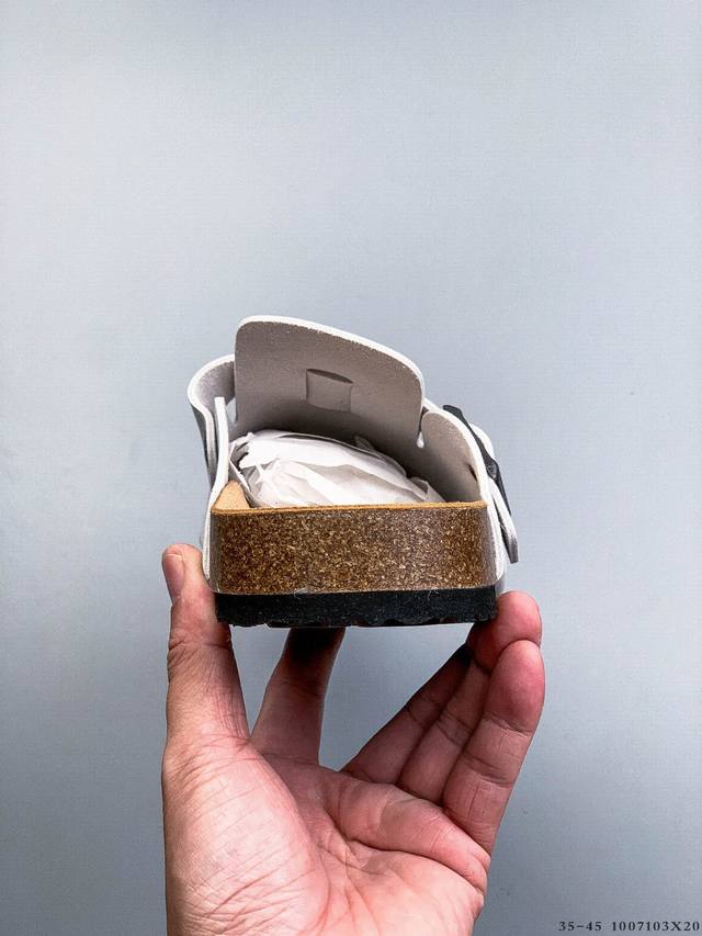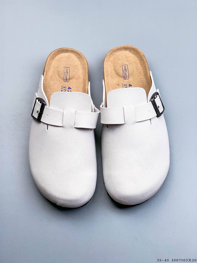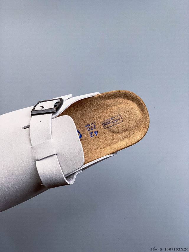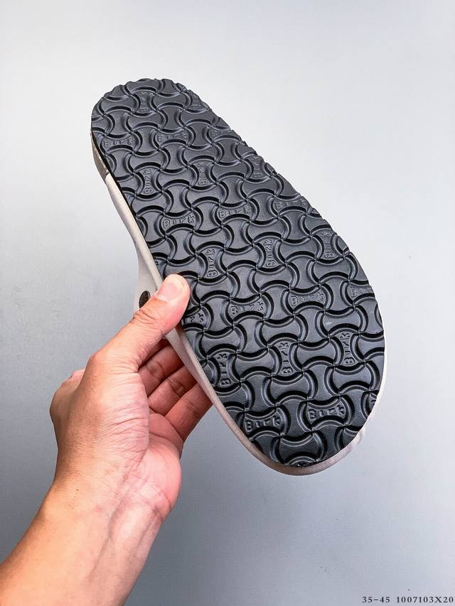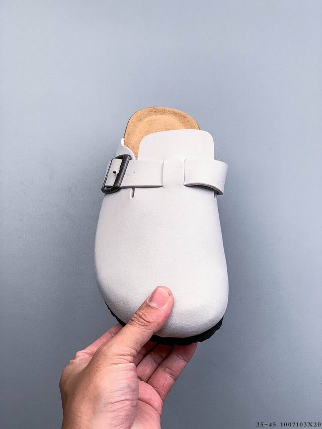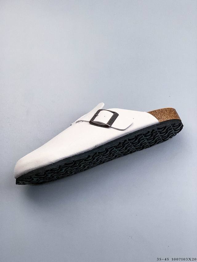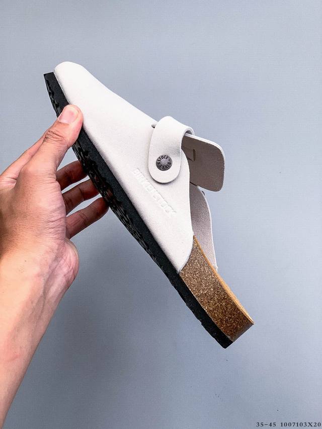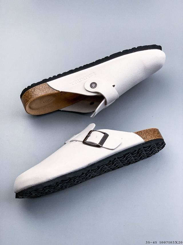 Birkenstock, a century-old German footwear brand, presents its new Autumn/Winter collection of closed-toe slippers. Made in Guangdong. Features soft cowhide leather, a cushioned cork rubber midsole, and a lightweight EVA outsole (7103X20).