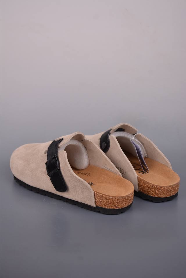 Birkenstock, a century-old German footwear brand, presents these slippers. Made with soft cowhide suede, featuring a lambswool insole and lining, a cushioned cork rubber midsole, and a solid-color wool lining for warmth and style. Official product number: 05607732229. Sizes: 35 36 37 38 39 40 41 42 43 44 45.