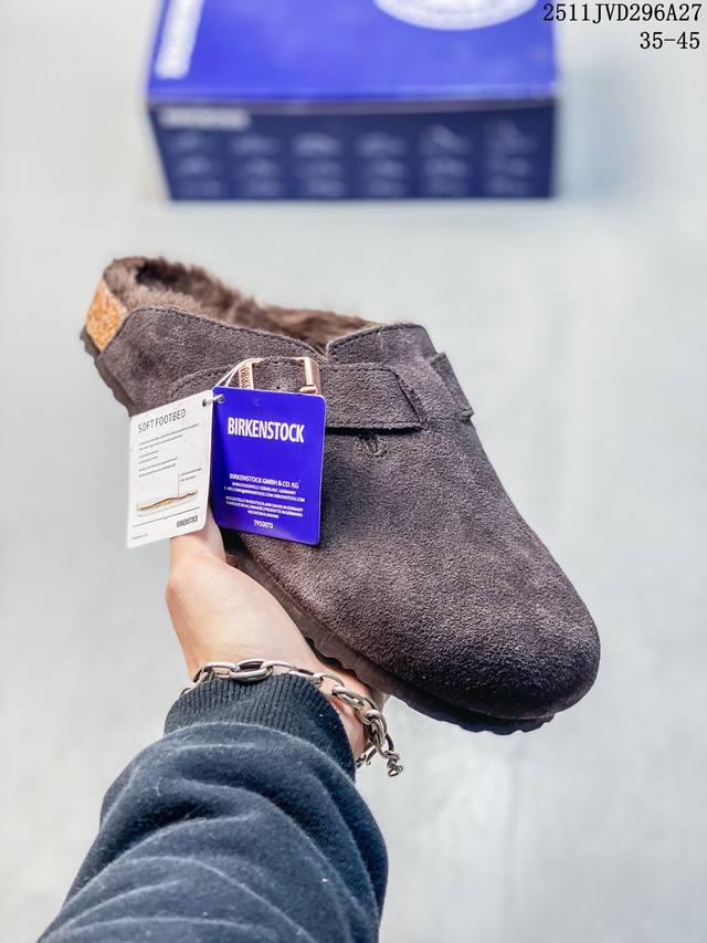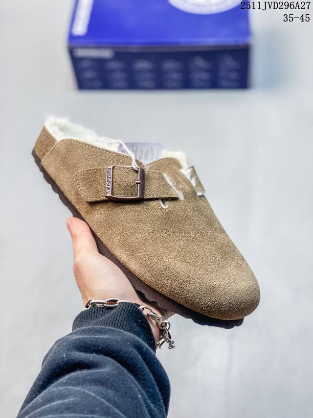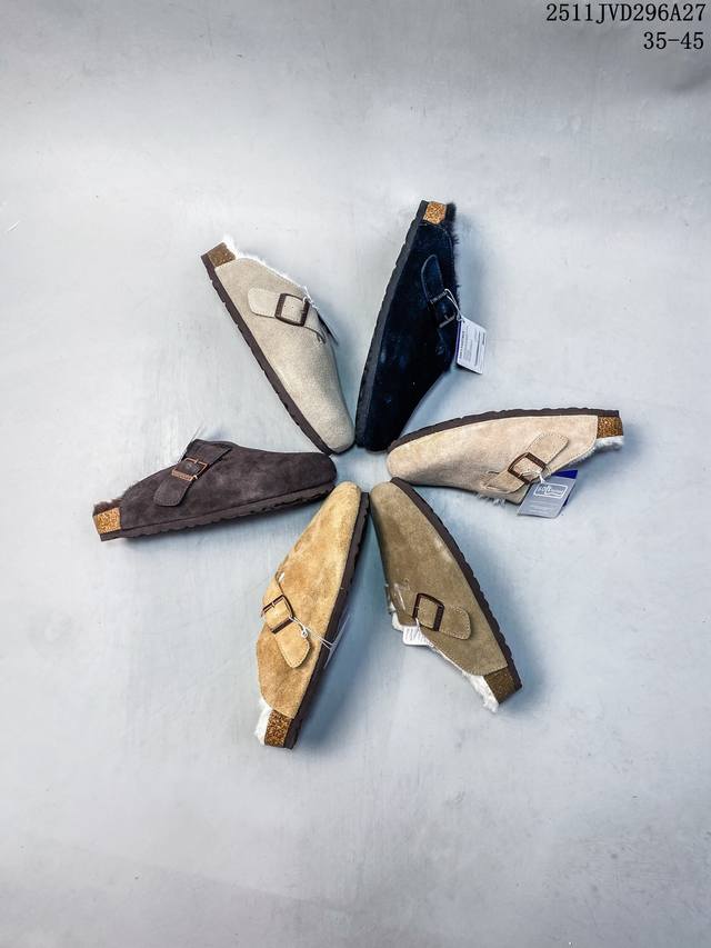 Birkenstock Boston Vl Birkenstock Suede Metal Buckle Cork Sole Closed-Toe Slippers. Soft cowhide suede with adjustable buckles for enhanced comfort. Ergonomic design distributes foot pressure and protects the ankle. Cork latex footbed has some elasticity, conforming to the foot shape after prolonged wear. Eva sole offers high resilience and tensile strength, providing excellent shock absorption and cushioning. Suitable for all seasons. The soft footbed features an additional foam cushioning layer for extra comfort and all-day support. Exclusive online launch. Made with meticulous German craftsmanship. Nubuck upper, pine midsole, Eva three-layer combination, premium cowhide outsole, hardware buckles. Export order. Sizes: 35-45. Code: 105934. Item Number: 0160371. 11Jvd296A27.